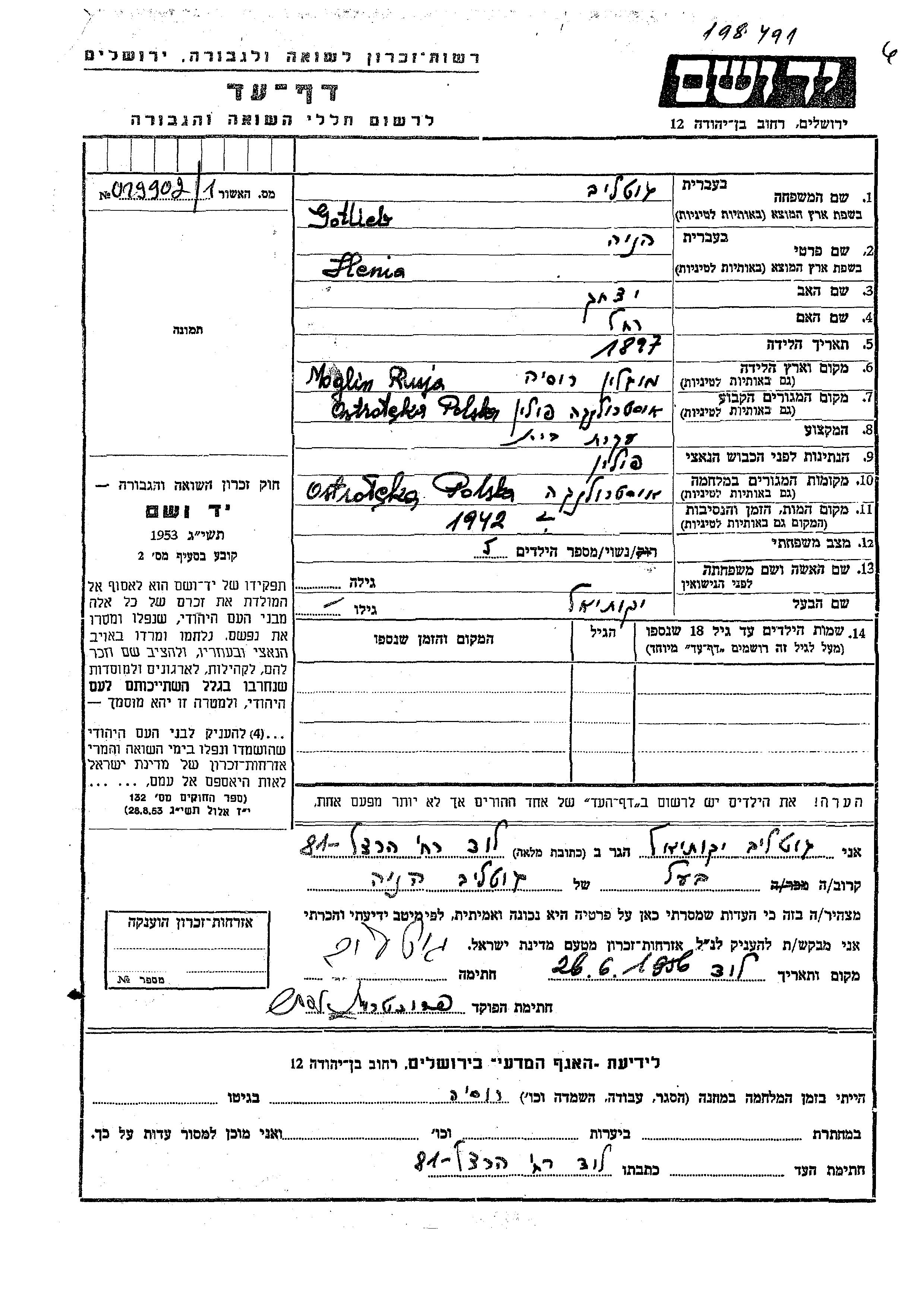 Henia Gotlieb wurde im Jahr 1897 in Moglin, Weißrussland (UdSSR) geboren. Sie war die Tochter von Yitzkhak und Rakhel. Sie war Hausfrau und mit Yekutiel Verheiratet. Vor dem Zweiten Weltkrieg lebte sie in Ostroleka, Polen. Während des Krieges war sie in Ostroleka, Polen.