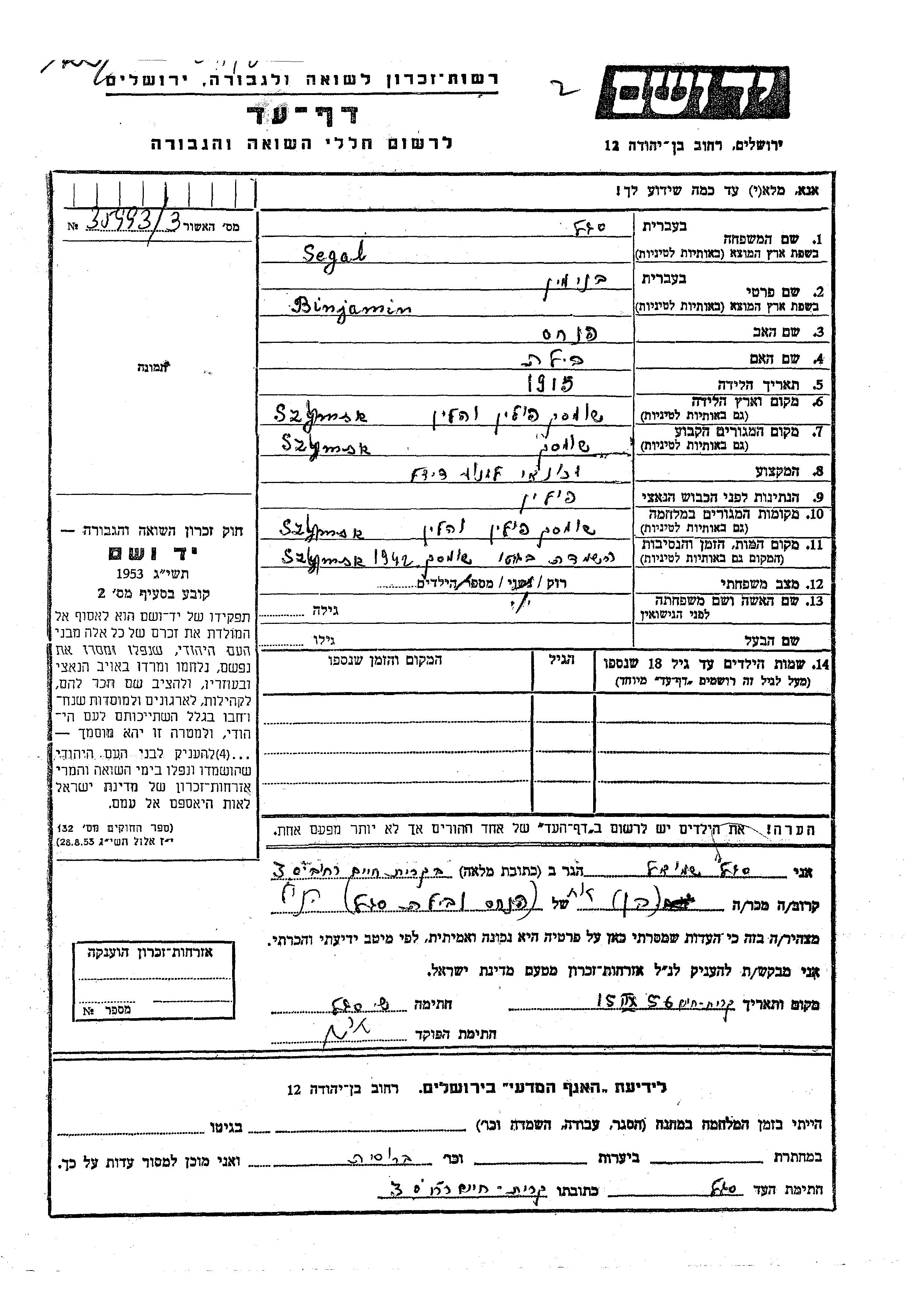 Binjamin Segal wurde im Jahr 1915 in Szumsk, Polen geboren. Er war der Sohn von Pinkhas und Bila. Er war Kfz-mechaniker und Ledig. Vor dem Zweiten Weltkrieg lebte er in Szumsk, Polen. Während des Krieges war er in Szumsk, Polen.