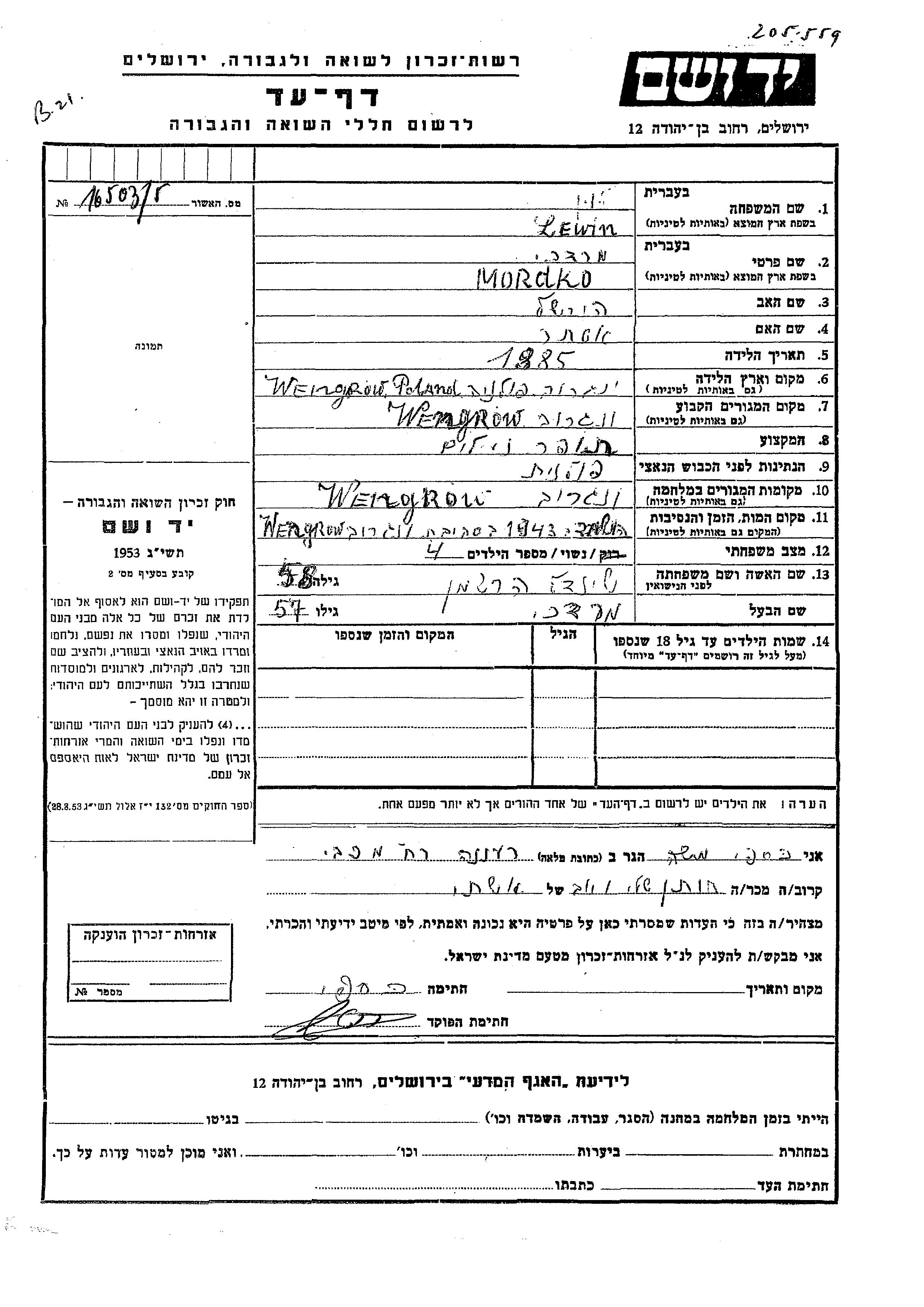 Mordko Lewin wurde im Jahr 1885 in Wengrow, Polen geboren. Er war der Sohn von Hirshel und Ester. Er war Schuhnäher und mit Sheindl, geb. Hershman Verheiratet. Vor dem Zweiten Weltkrieg lebte er in Wengrow, Polen. Während des Krieges war er in Wengrow, Polen.