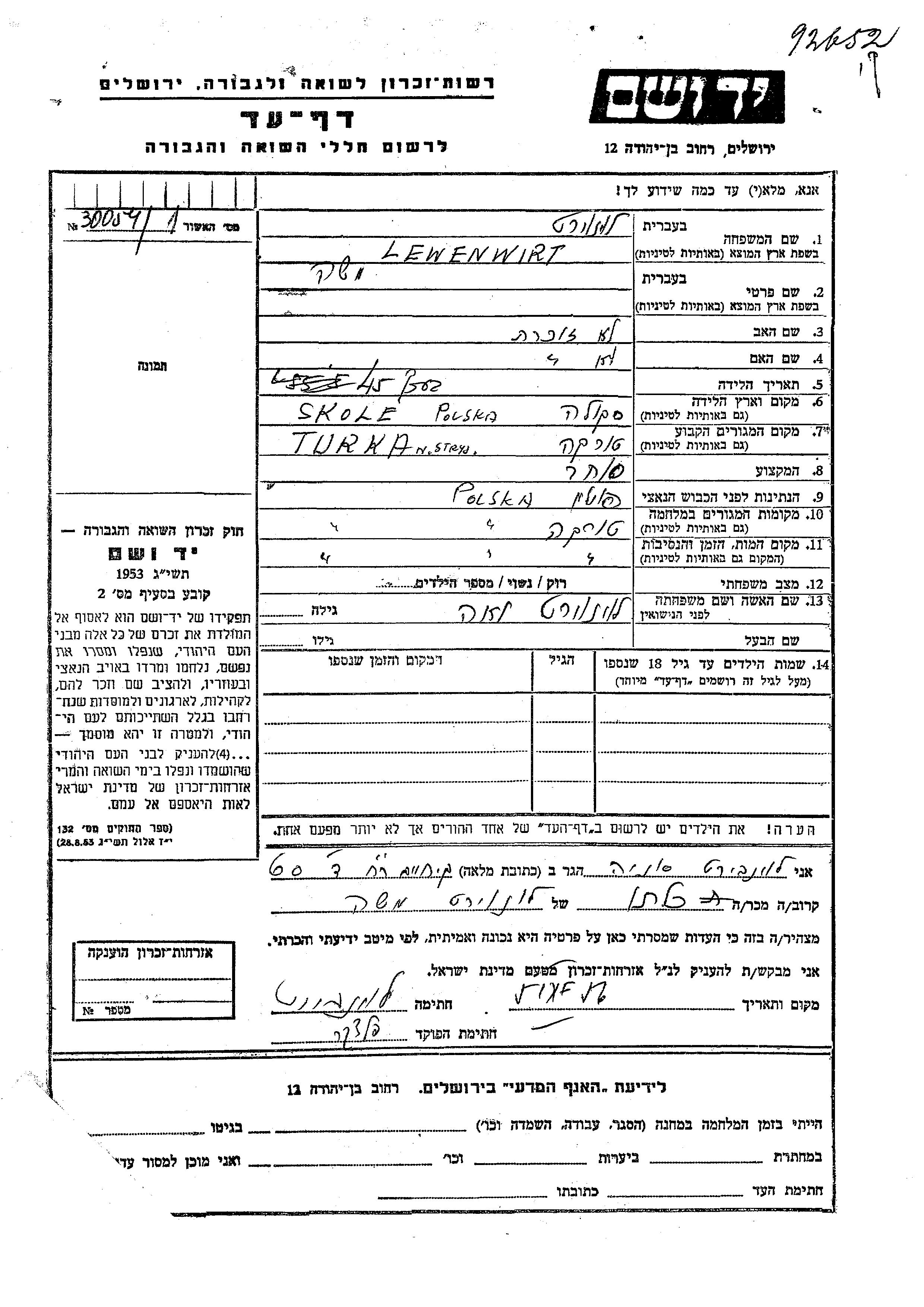 Moshe Lewenwirt wurde in Skole, Polen geboren. Er war Kaufmann/-frau und mit Lea Verheiratet. Vor dem Zweiten Weltkrieg lebte er in Turka nad Stryjem, Polen. Während des Krieges war er in Turka nad Stryjem, Polen.