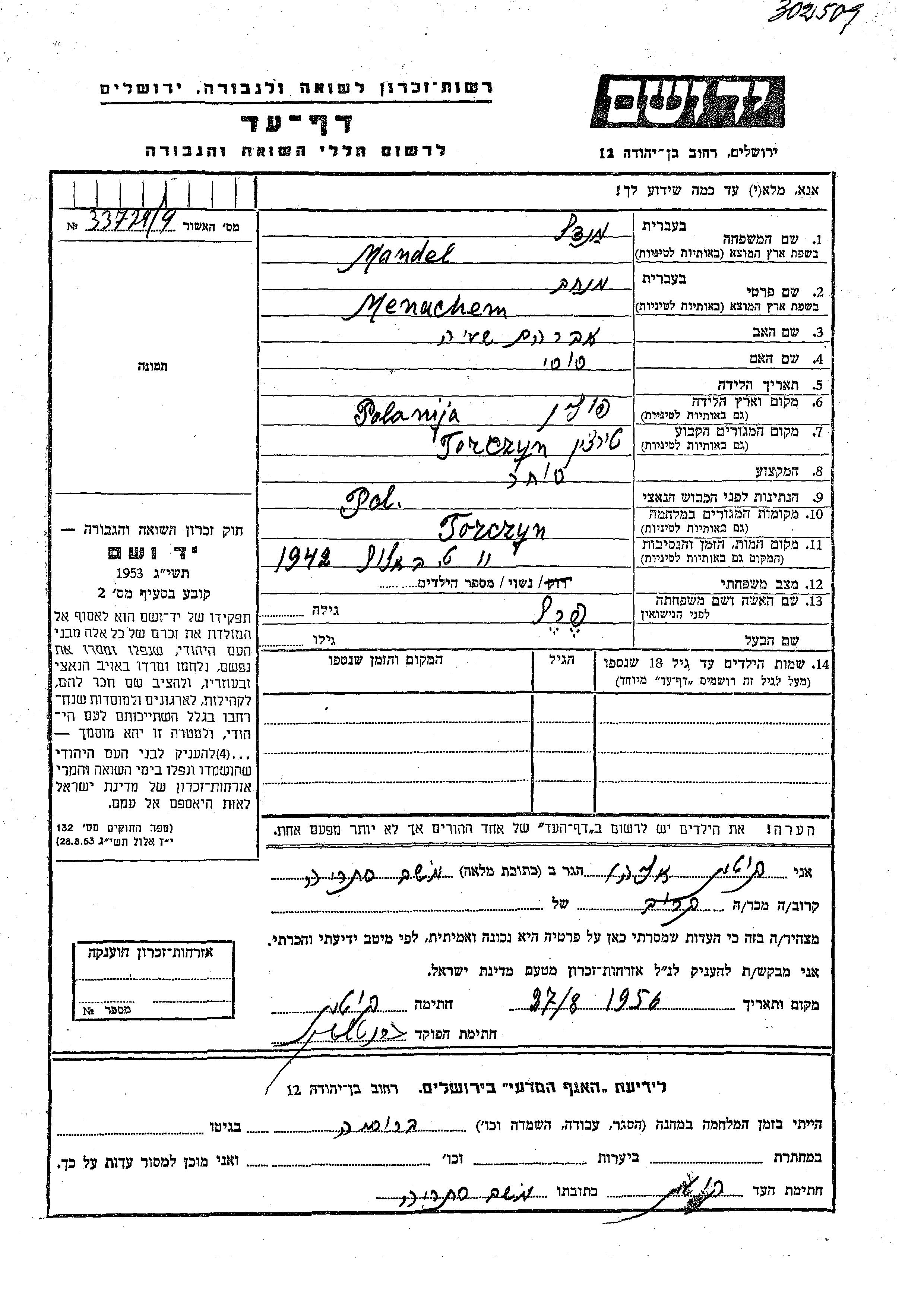 Manachem wurde in der Schoah ermordet. Todesort: Tarczyn, Polen im Jahr 1942.