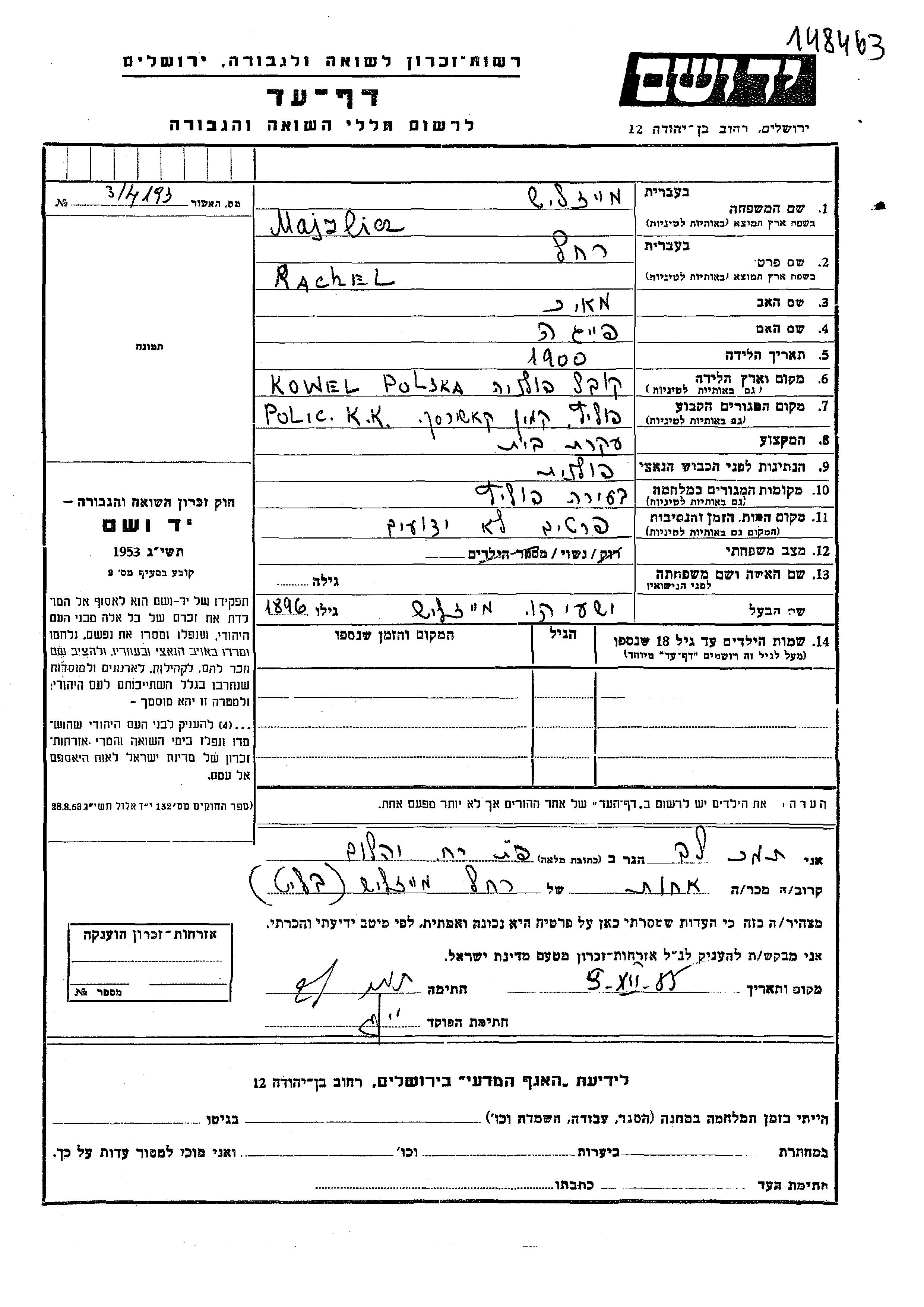 Rachel Majzlicz Meizlish wurde im Jahr 1900 in Kowel, Polen geboren. Sie war die Tochter von Meir und Feiga. Sie war Hausfrau und mit Yeshayahu Verheiratet. Vor dem Zweiten Weltkrieg lebte sie in Police, Polen. Während des Krieges war sie in Police, Polen.