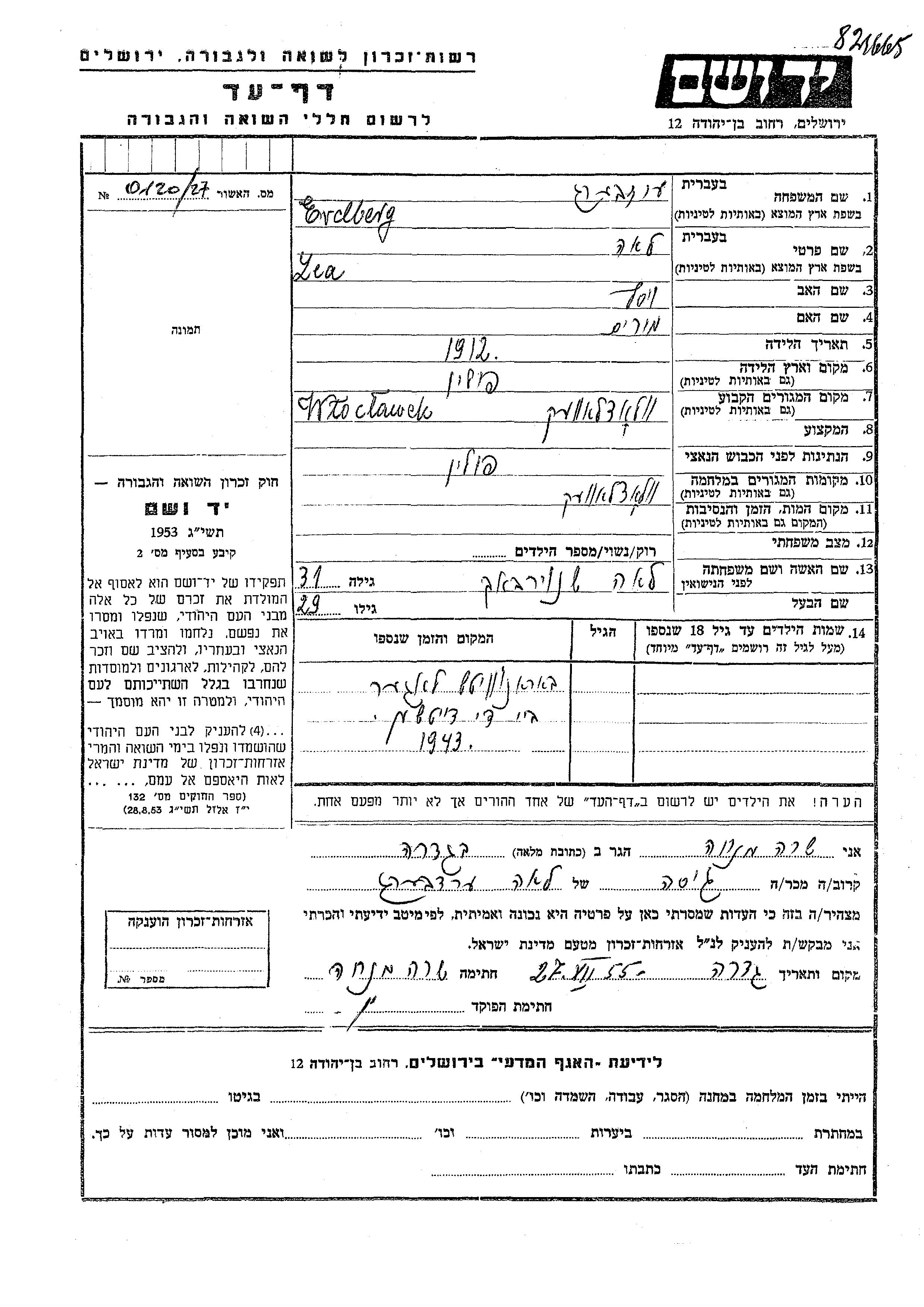Lea Erdberg wurde im Jahr 1912 geboren. Sie war die Tochter von Yosef und Miriam. Vor dem Zweiten Weltkrieg lebte sie in Wloclawek, Polen. Während des Krieges war sie in Wloclawek, Polen.