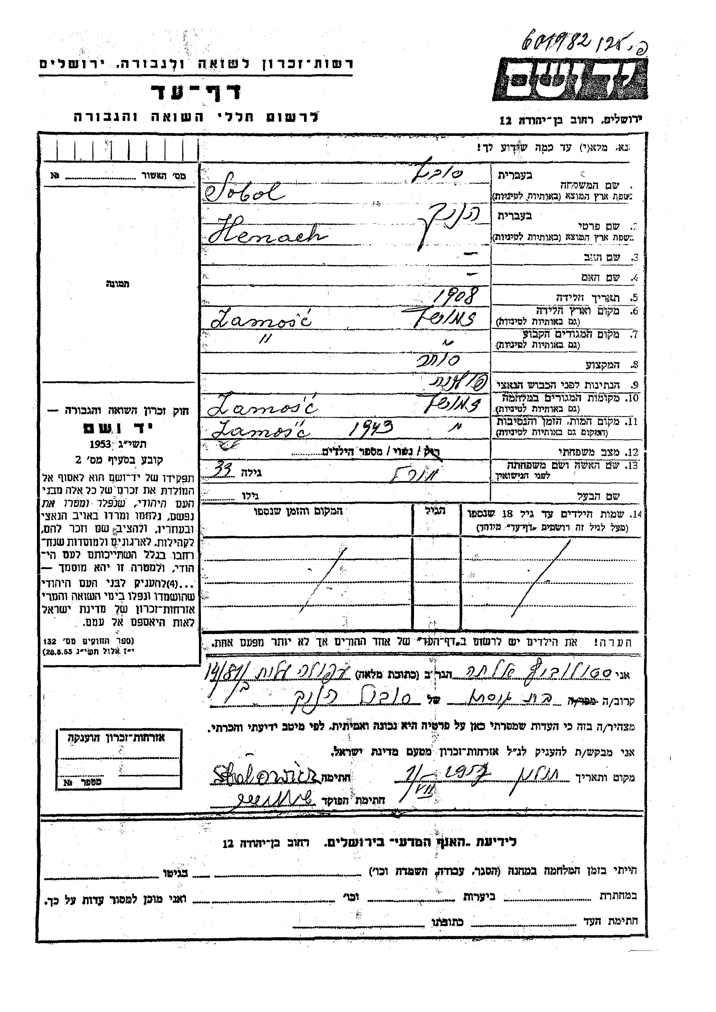Henach wurde in der Schoah ermordet. Todesort: Zamosc, Polen im Jahr 1943.