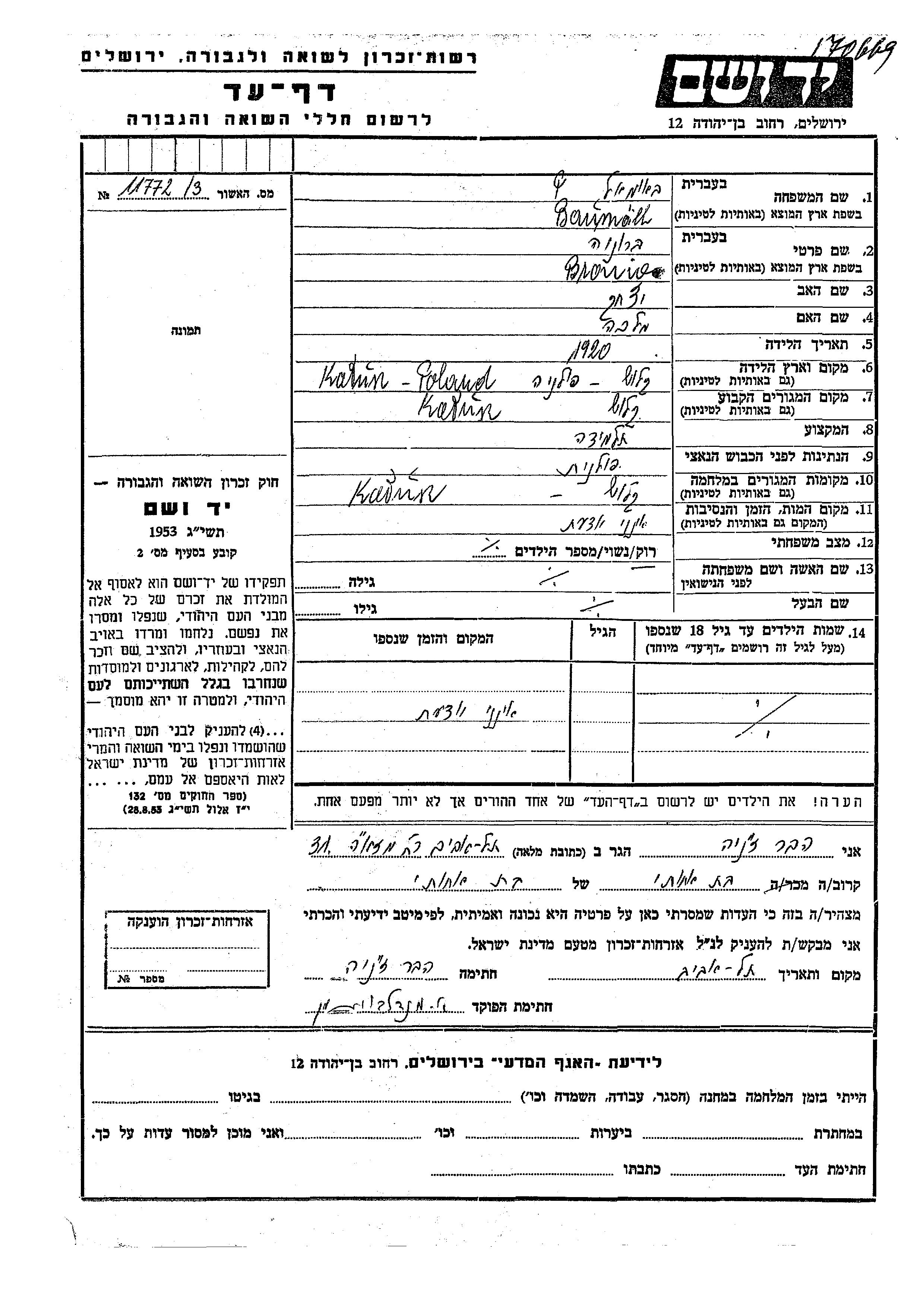 Bronia Baumöhl, geb. Baumöhl wurde im Jahr 1920 in Kalusz, Polen geboren. Sie war die Tochter von Yitzkhak und Malka. Sie war Schüler/-in. Vor dem Zweiten Weltkrieg lebte sie in Kalusz, Polen. Während des Krieges war sie in Kalusz, Polen.