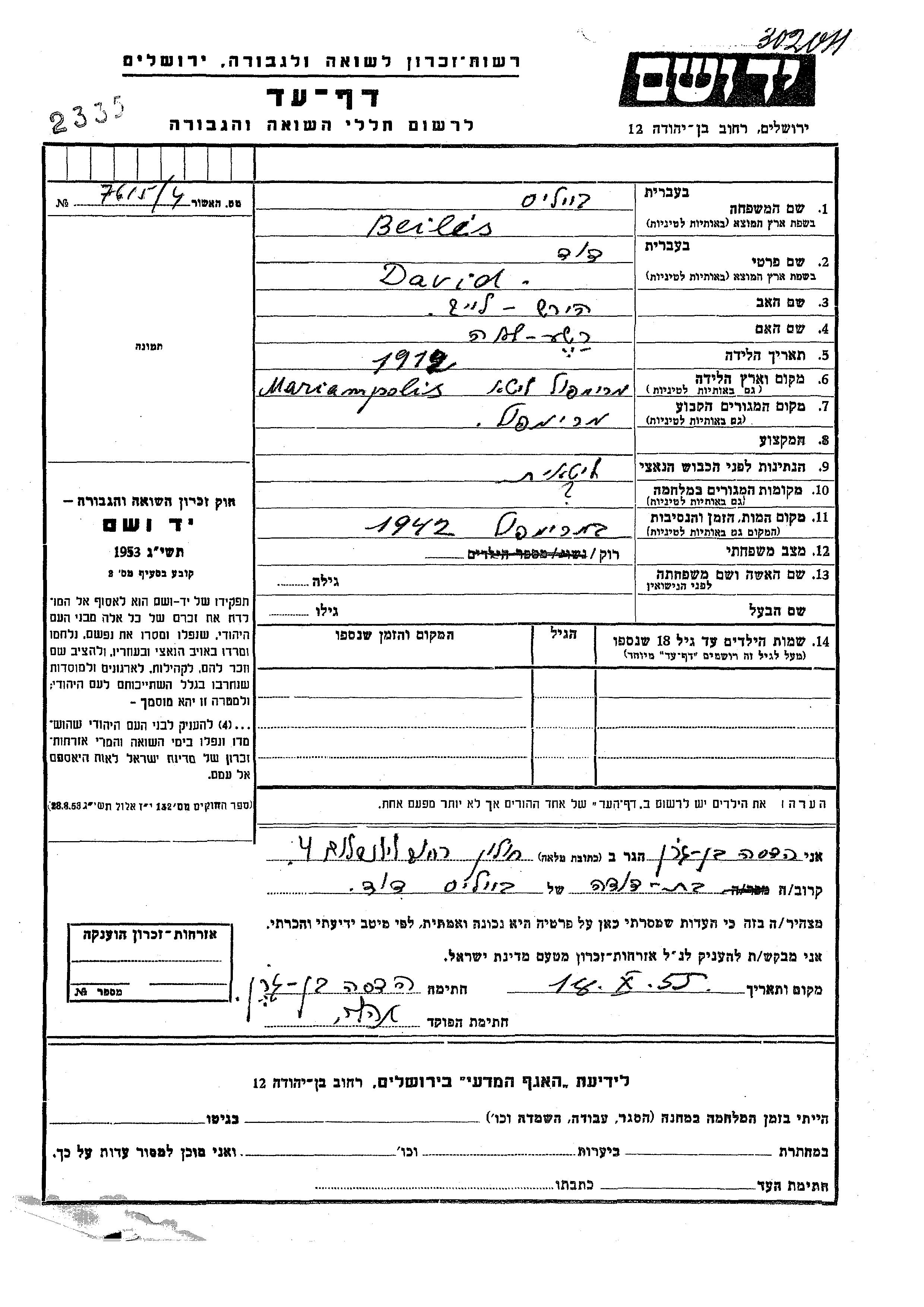 David Beilis wurde im Jahr 1912 in Mariampol, Litauen geboren. Er war der Sohn von Hirsh Leib und Rasha Lea. Er war Ledig. Vor dem Zweiten Weltkrieg lebte er in Mariampol, Litauen.