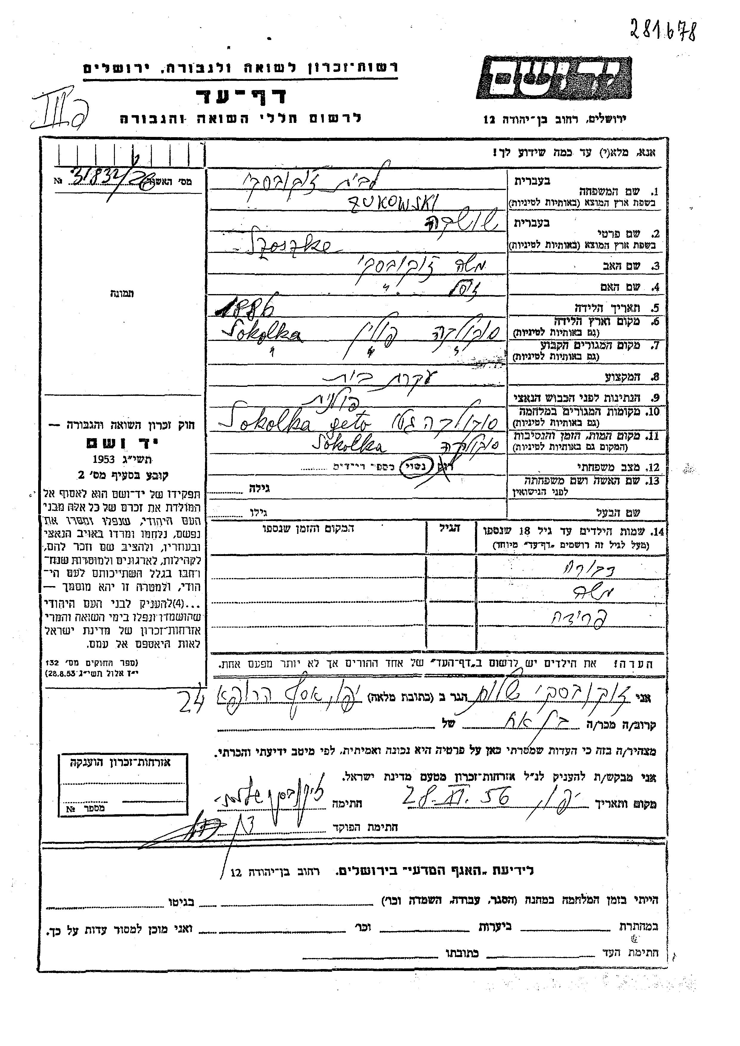 Szoszka Zukowski, geb. Zhukovski wurde im Jahr 1886 in Sokolka, Polen geboren. Sie war die Tochter von Moshe und Zysl. Sie war Hausfrau und Verheiratet. Vor dem Zweiten Weltkrieg lebte sie in Sokolka, Polen. Während des Krieges war sie in Sokolka, Polen.