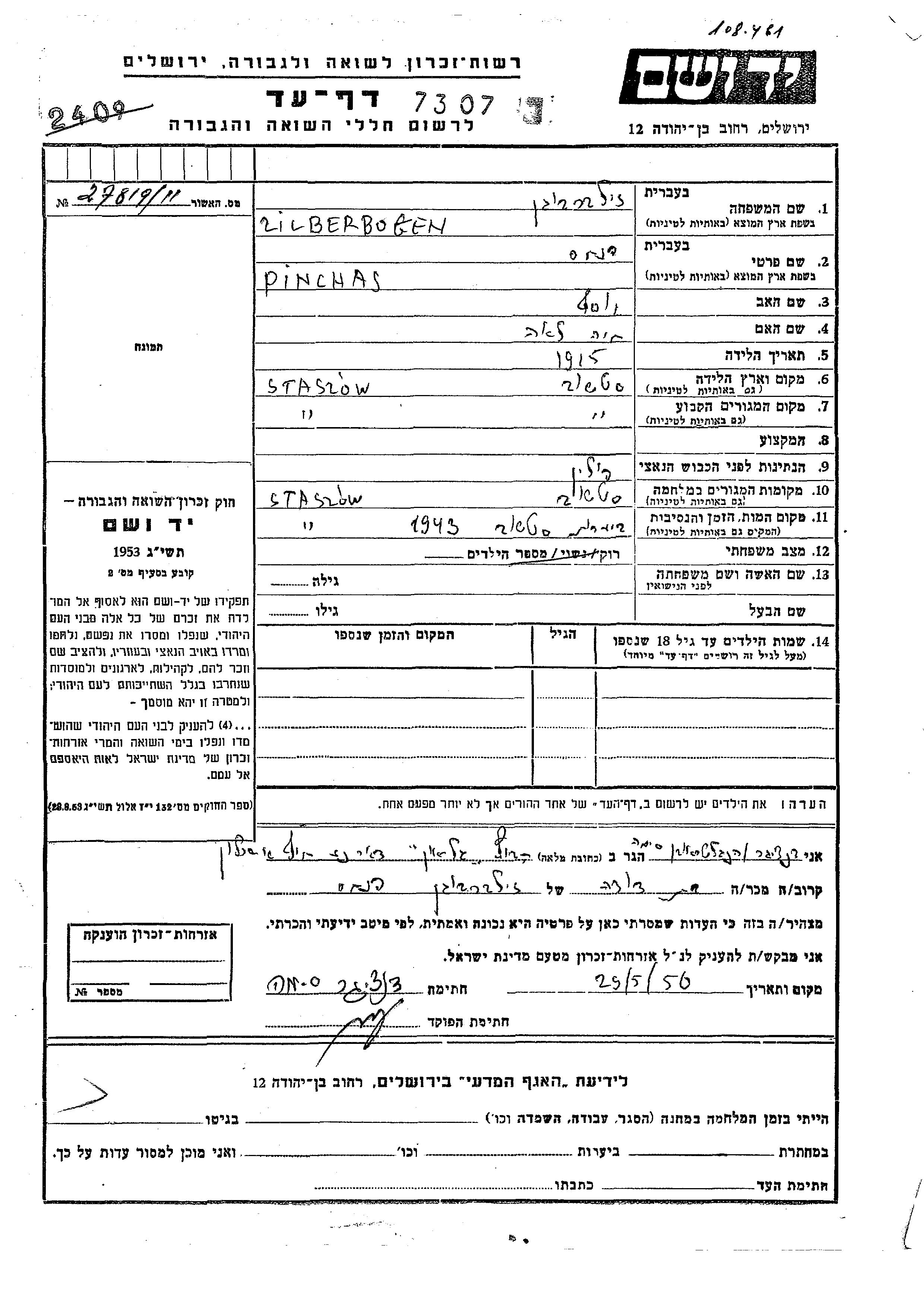 Zilberbogen Pinchas 1915 Staszow, Polen Gedenkblatt