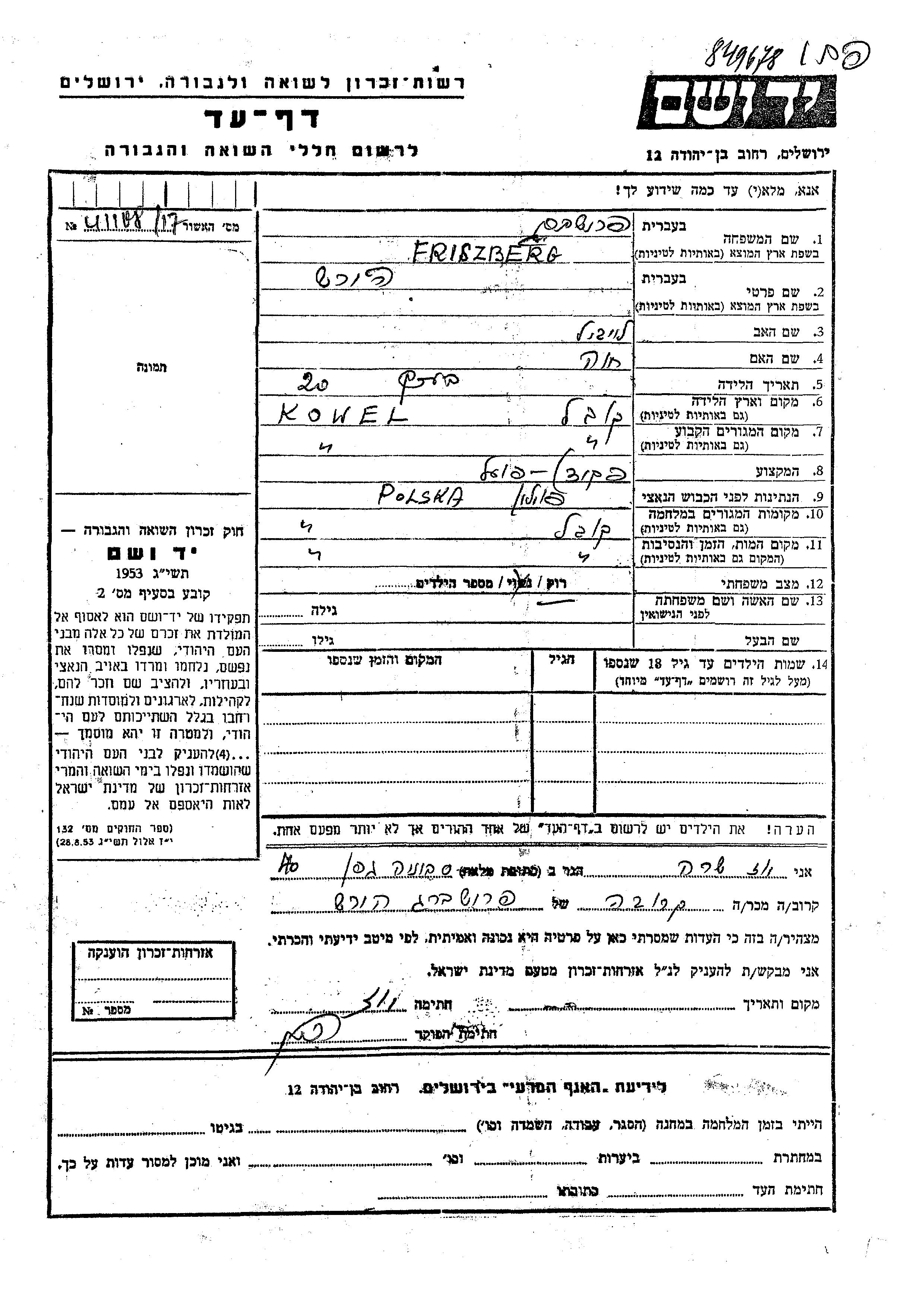 Friszberg Hirsh Kowel, Polen Gedenkblatt