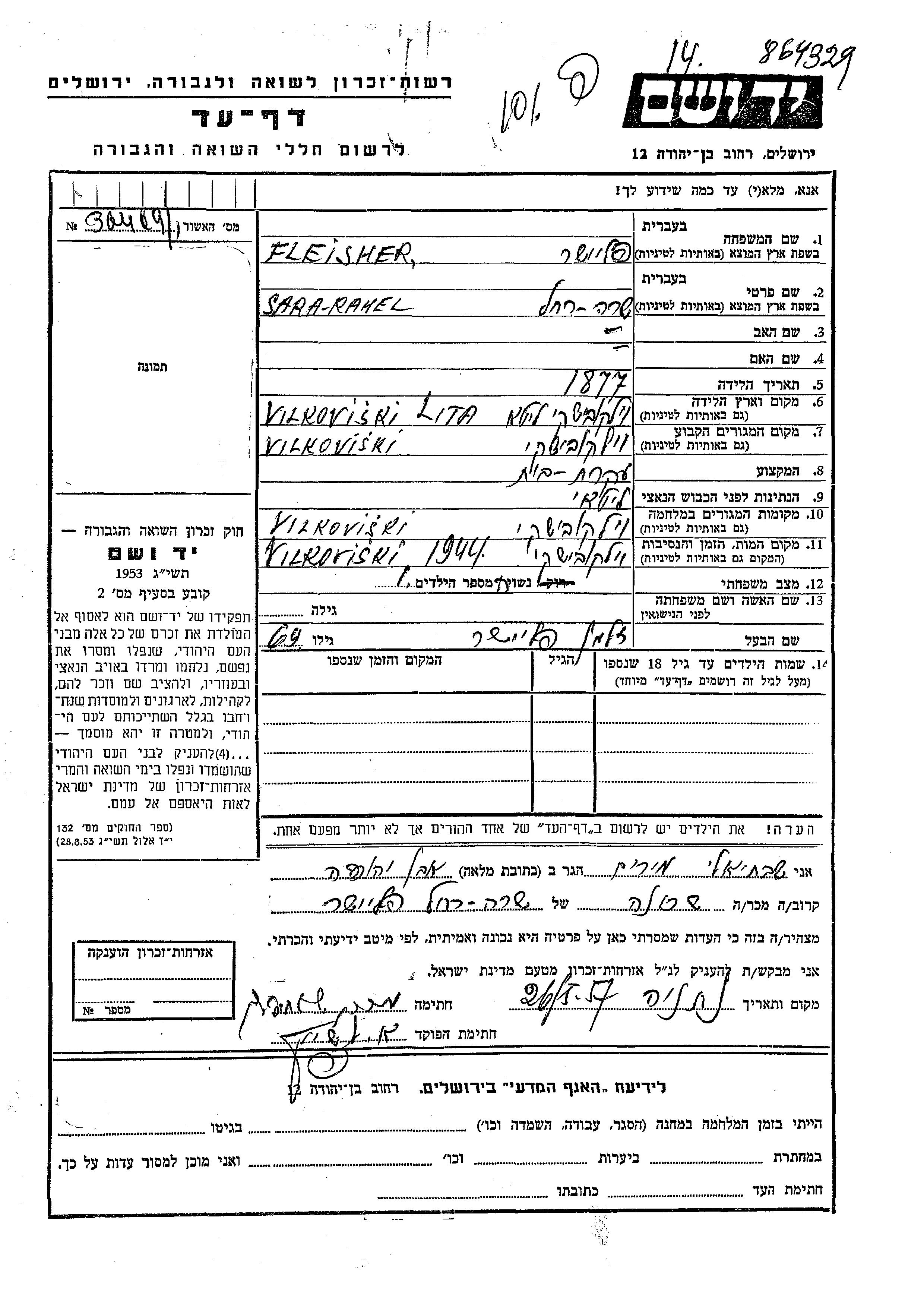 Rahel Sara Fleisher wurde im Jahr 1877 in Vilkovishk, Litauen geboren. Sie war Hausfrau und mit Zalman Verheiratet. Vor dem Zweiten Weltkrieg lebte sie in Vilkovishk, Litauen. Während des Krieges war sie in Vilkovishk, Litauen.