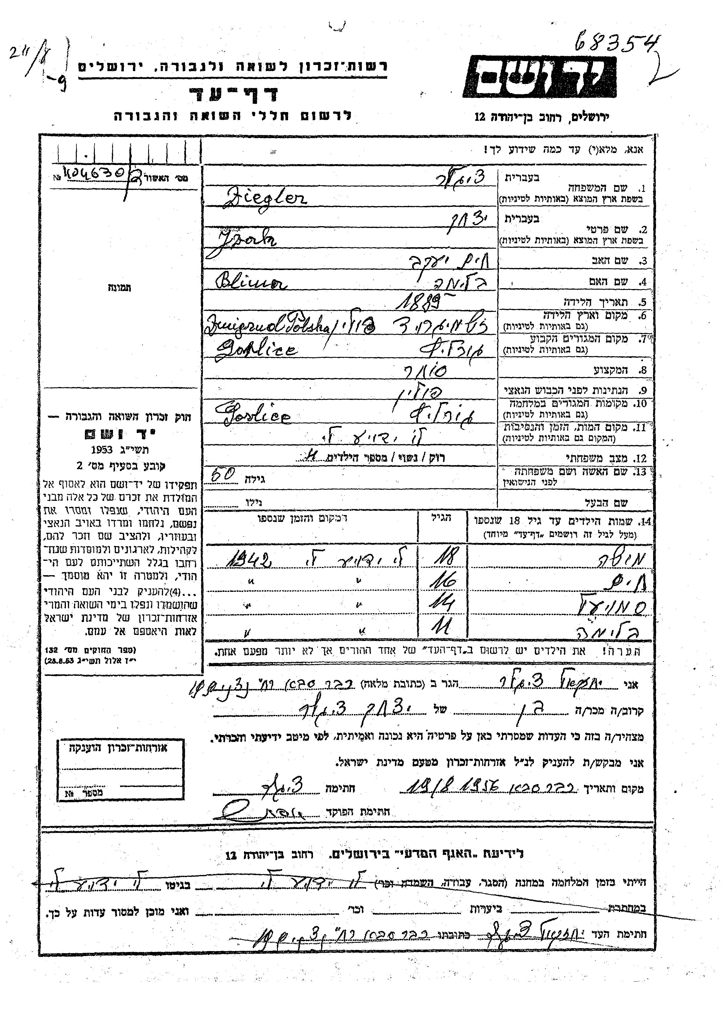 Jzak Ziegler wurde im Jahr 1889 in Zmigrod, Polen geboren. Er war der Sohn von Khaim Yaakov und Blima. Er war Kaufmann/-frau und Verheiratet. Vor dem Zweiten Weltkrieg lebte er in Gorlice, Polen. Während des Krieges war er in Gorlice, Polen.