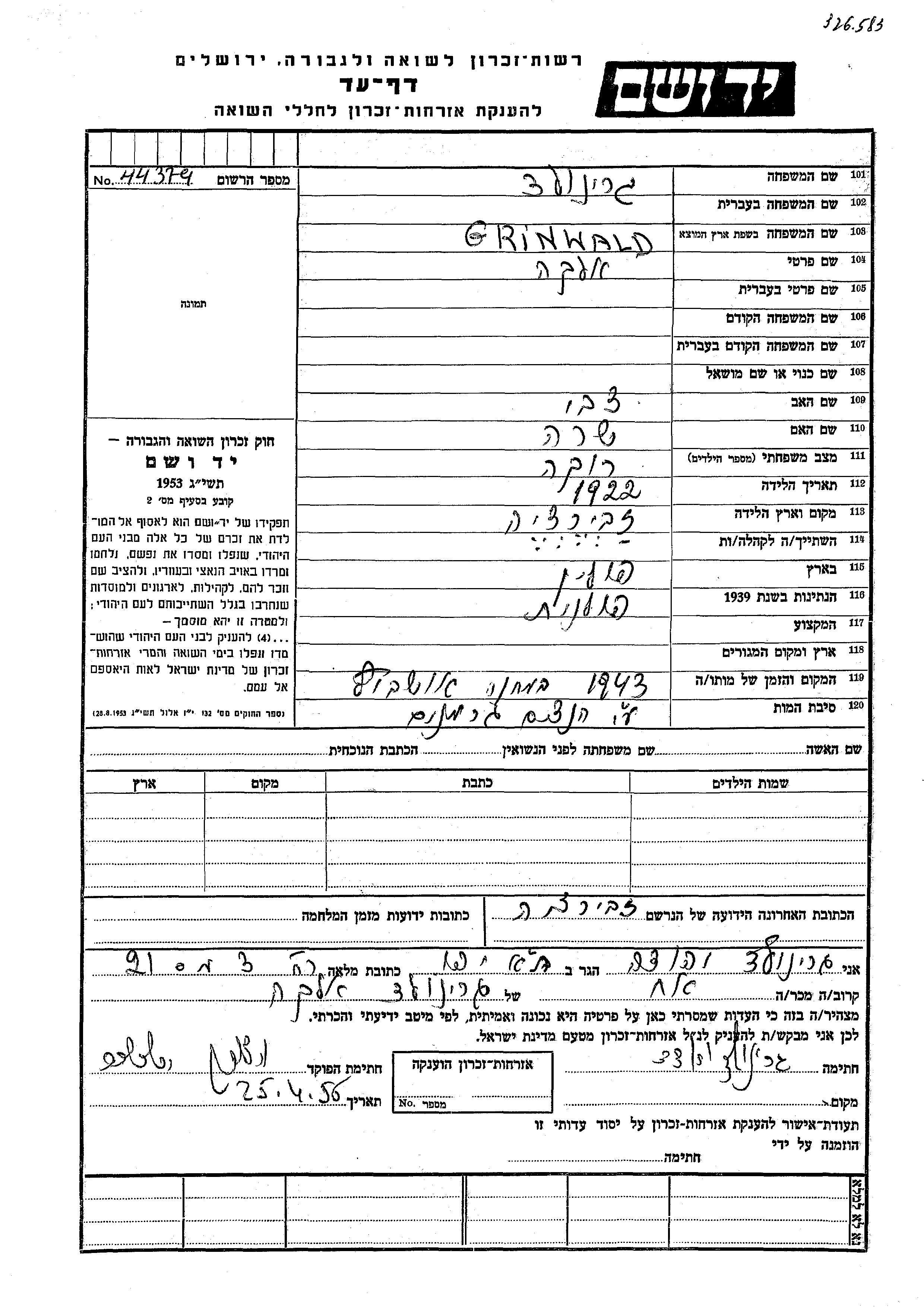Elka wurde in der Schoah ermordet. Todesort: Auschwitz, Polen im Jahr 1943.