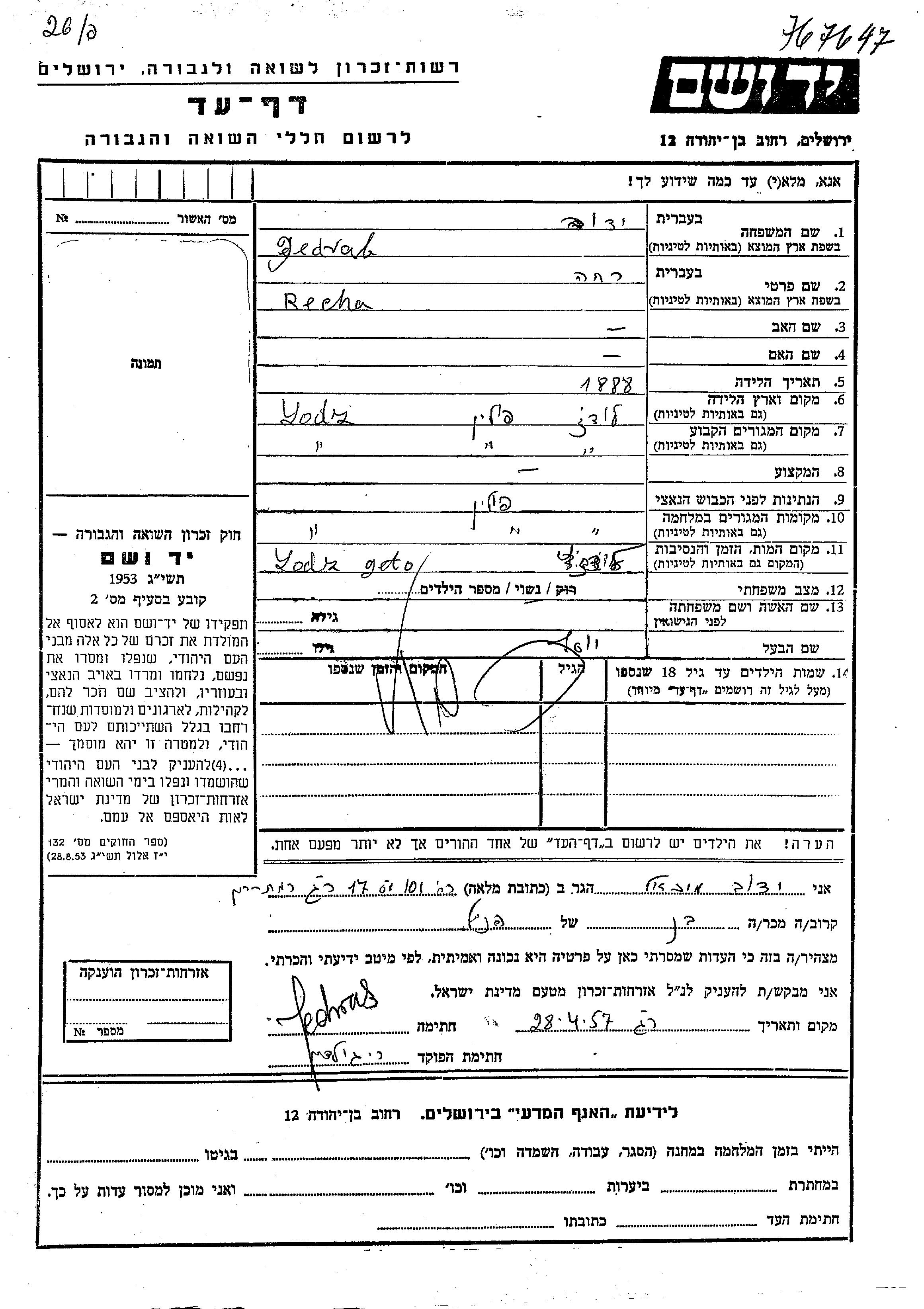 Recha Jedvab wurde im Jahr 1888 in Lodz, Polen geboren. Sie war mit Yosef Verheiratet. Vor dem Zweiten Weltkrieg lebte sie in Lodz, Polen. Während des Krieges war sie in Lodz, Polen.