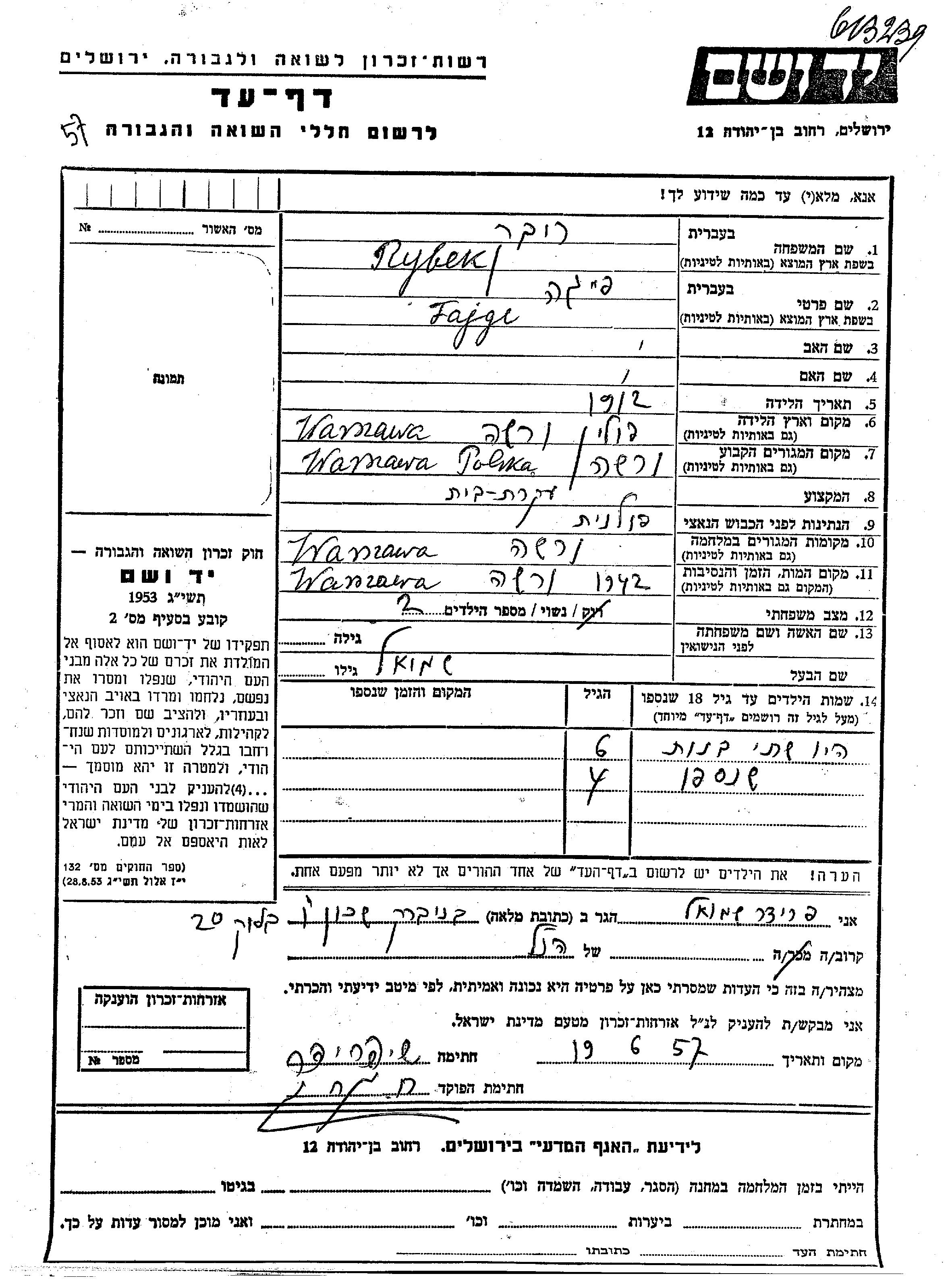 Fajge Rybek wurde im Jahr 1912 in Warszawa, Polen geboren. Sie war Hausfrau und mit Shmuel Verheiratet. Vor dem Zweiten Weltkrieg lebte sie in Warszawa, Polen. Während des Krieges war sie in Warszawa, Polen.