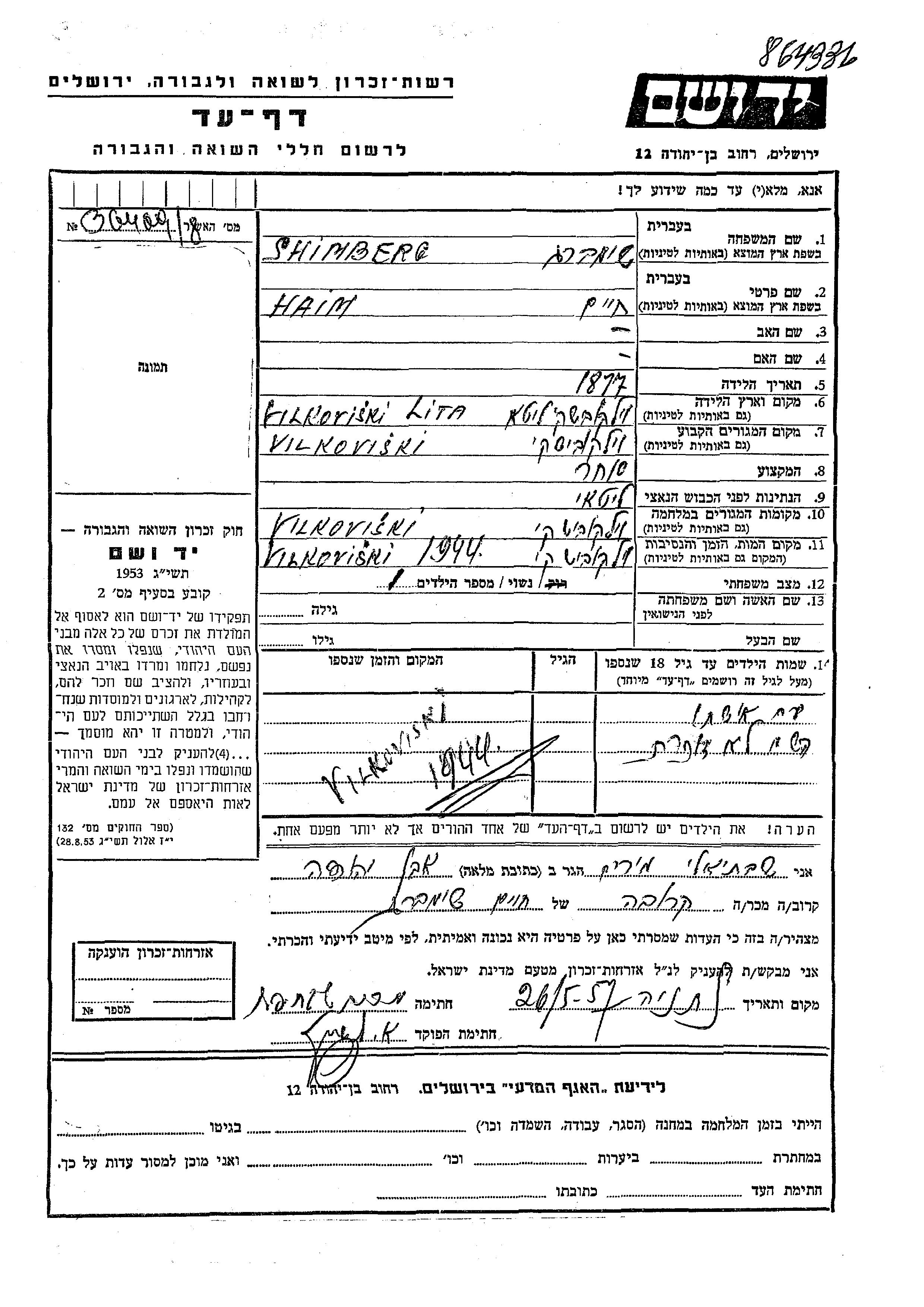 Haim Shimberg wurde im Jahr 1877 in Vilkovishk, Litauen geboren. Er war Kaufmann/-frau und Verheiratet. Vor dem Zweiten Weltkrieg lebte er in Vilkovishk, Litauen. Während des Krieges war er in Vilkovishk, Litauen.