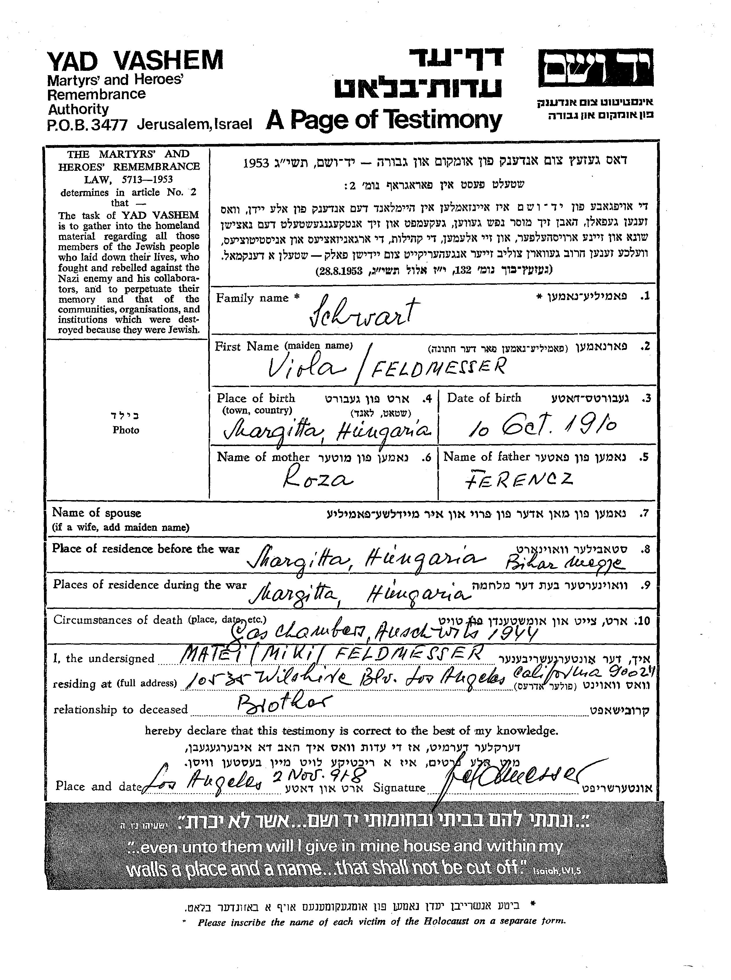 Viola Schwart, geb. Feldmesser wurde im Jahr 1910 in Margitta, Rumänien geboren. Sie war die Tochter von Ferencz und Roza. Sie war Verheiratet. Vor dem Zweiten Weltkrieg lebte sie in Margitta, Rumänien. Während des Krieges war sie in Margitta, Rumänien.