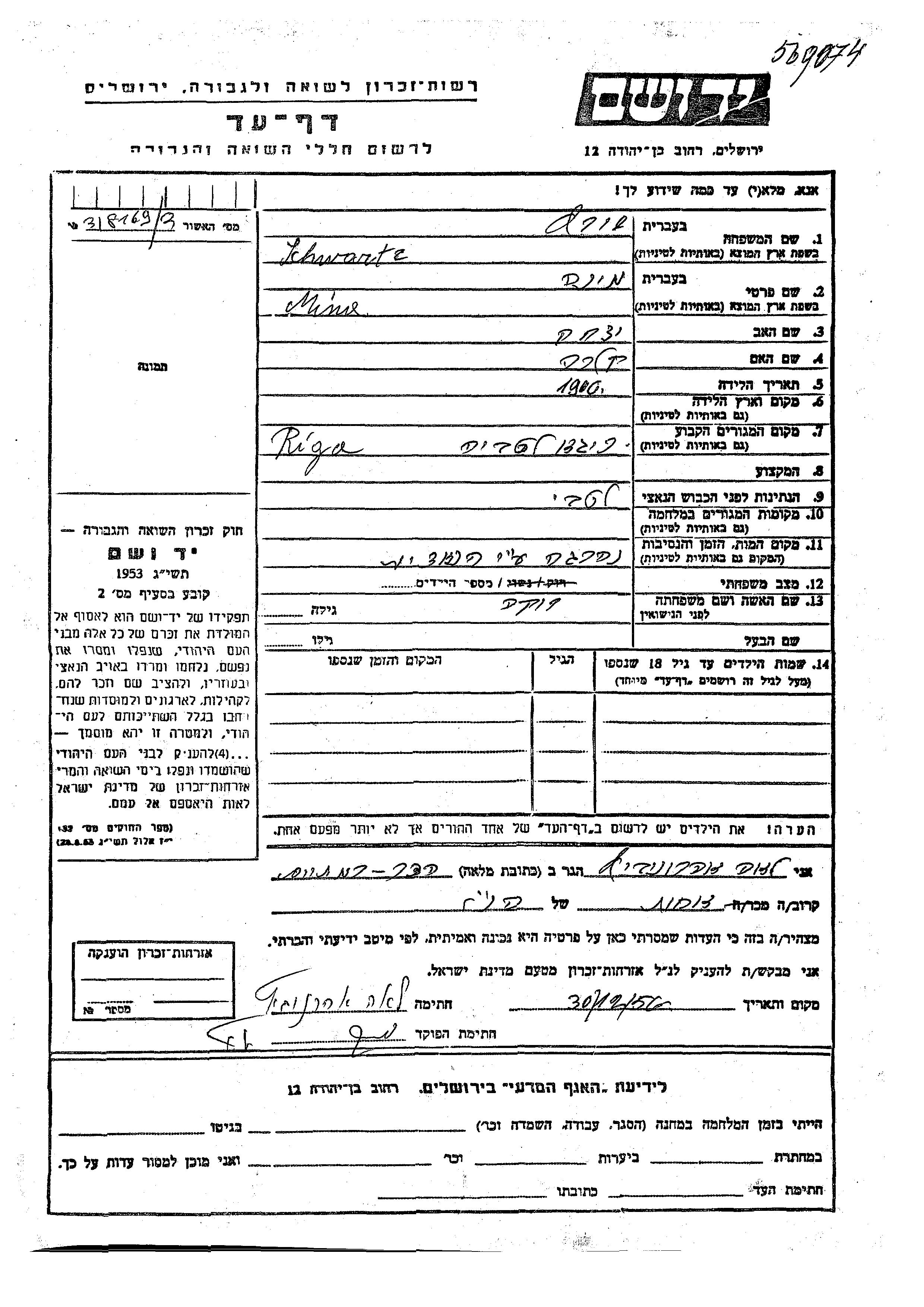 Mina Schwartc wurde im Jahr 1906 geboren. Sie war die Tochter von Yitzkhak und Klara. Sie war Ledig. Vor dem Zweiten Weltkrieg lebte sie in Riga, Lettland.