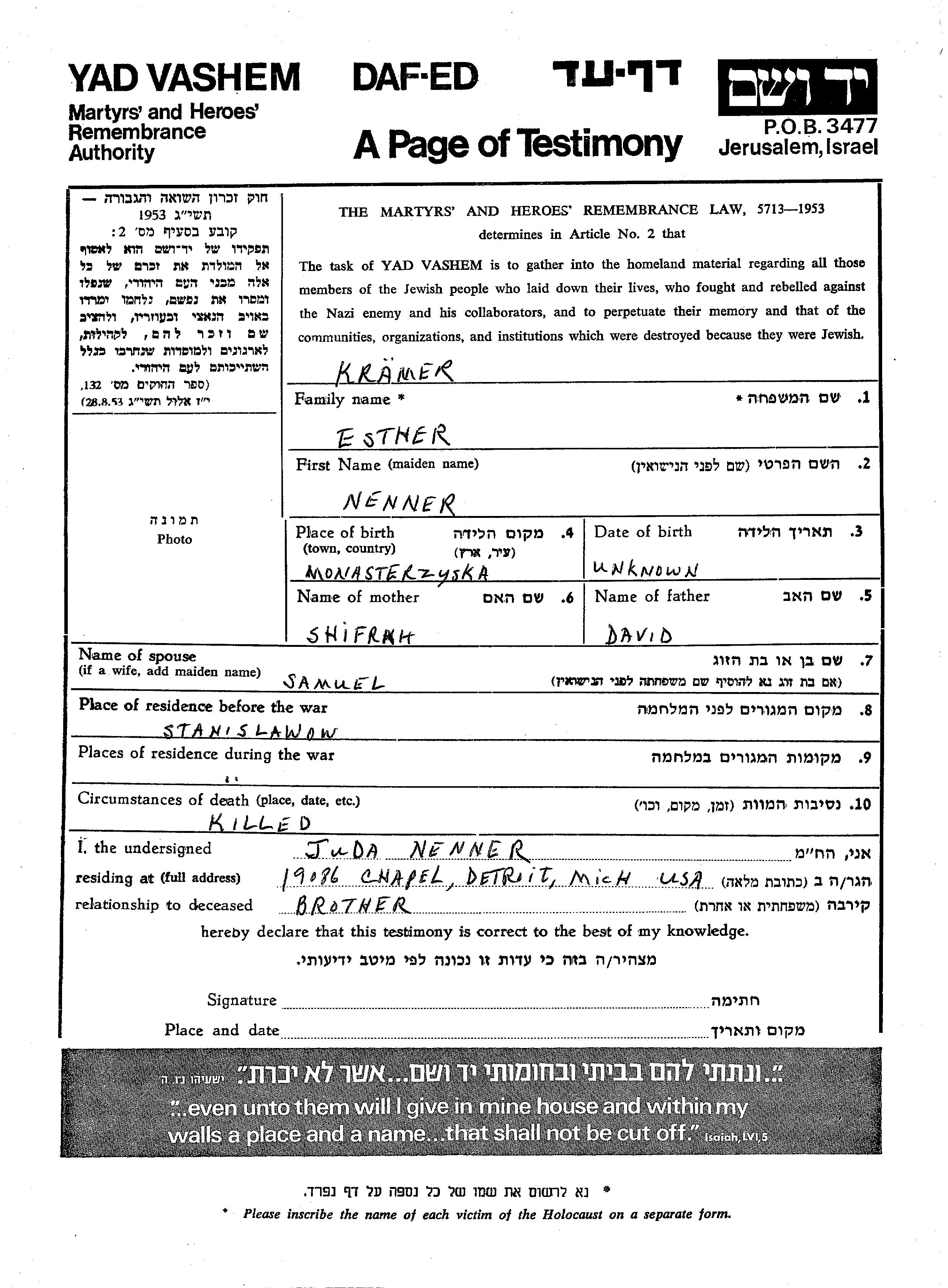 Esther Kremer, geb. Nenner wurde in Monasterzyska, Polen geboren. Sie war die Tochter von David und Shifrah. Vor dem Zweiten Weltkrieg lebte sie in Stanislawow, Polen.