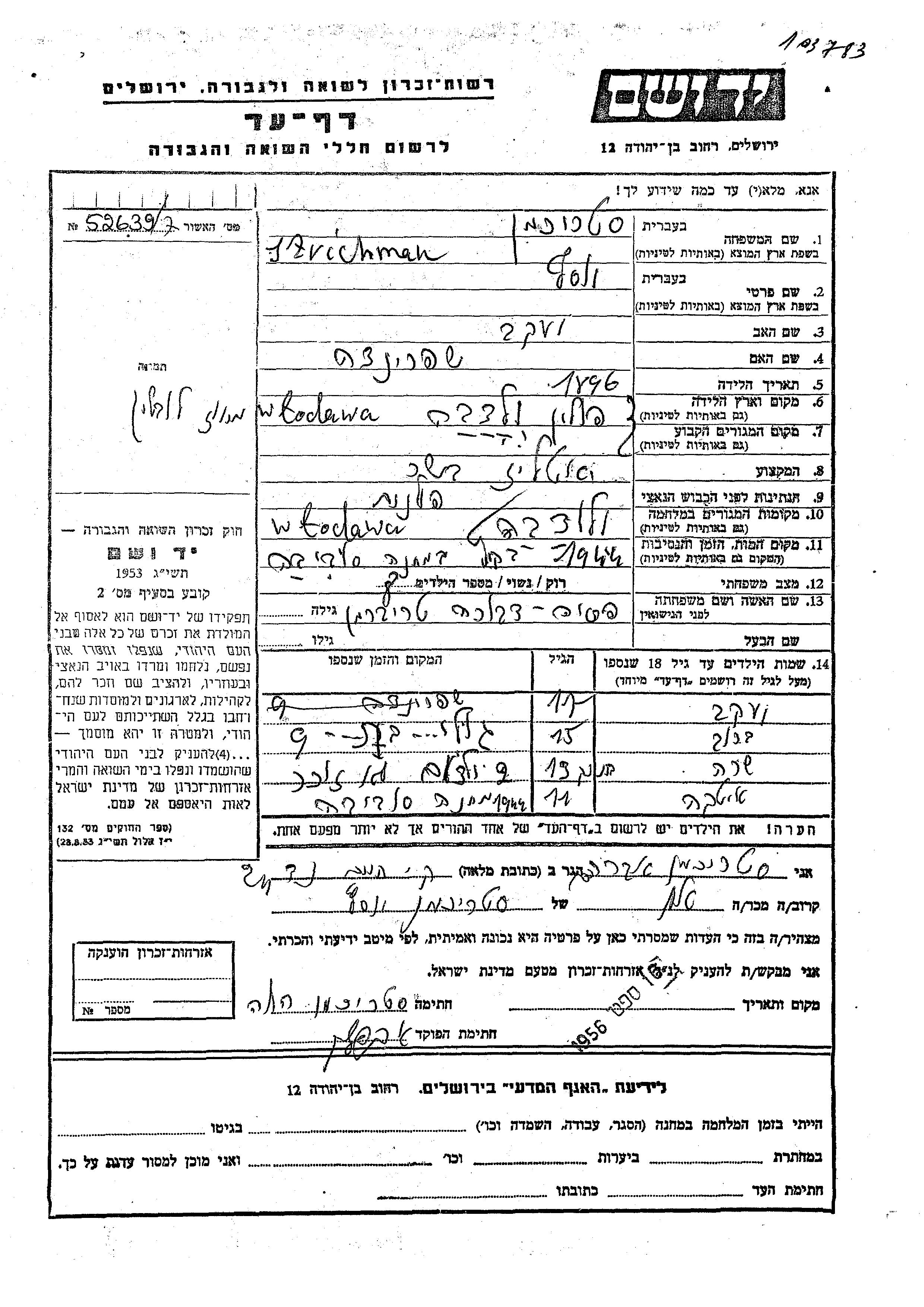 Yosef Strichman wurde im Jahr 1896 in Wlodawa, Polen geboren. Er war der Sohn von Yaakov und Shprintza. Er war mit Pesia Dvora, geb. Treiberman Verheiratet. Vor dem Zweiten Weltkrieg lebte er in Wlodawa, Polen. Während des Krieges war er in Wlodawa, Polen.