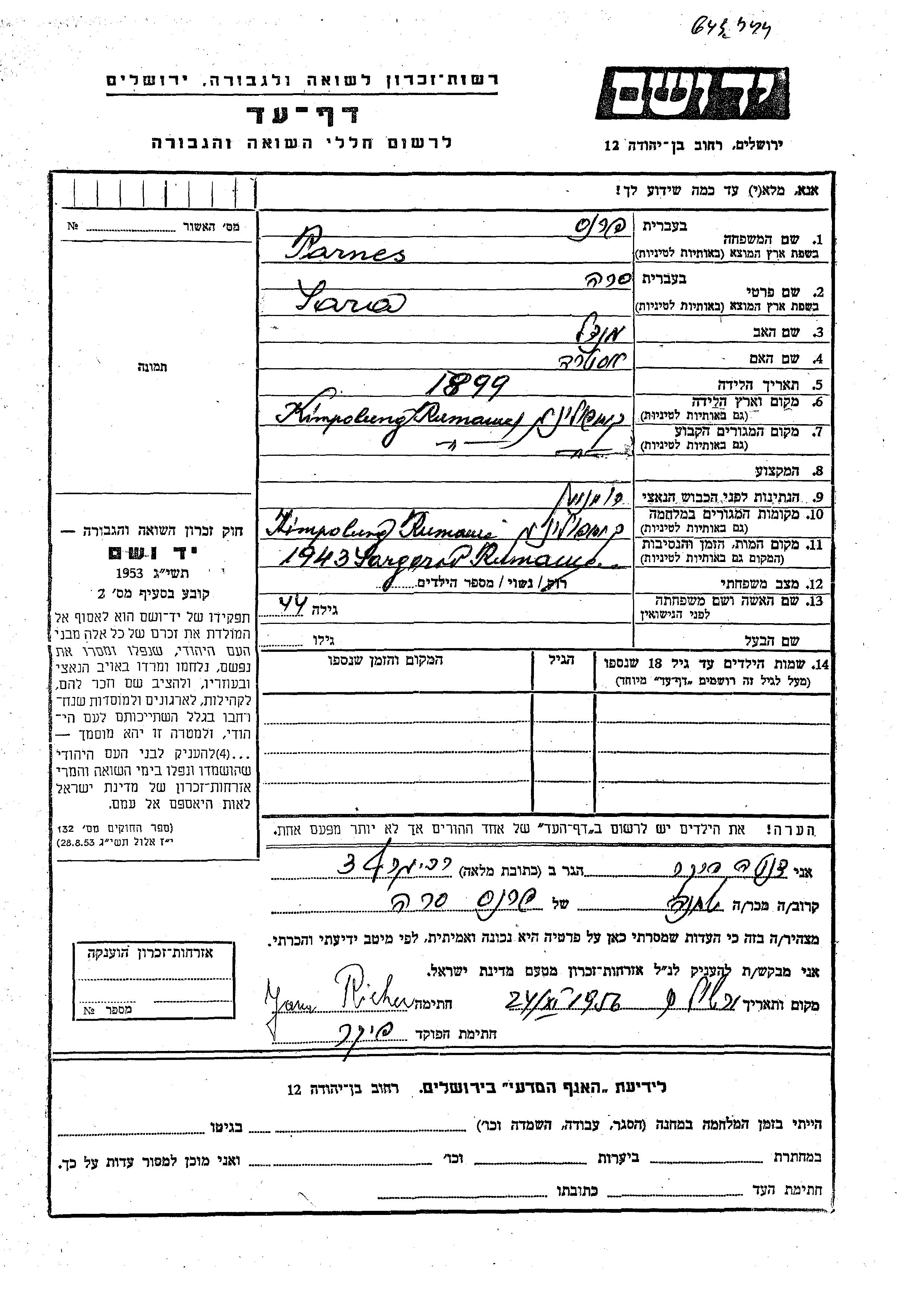Parnes Sara 1899 Kimpolung, Rumänien Gedenkblatt