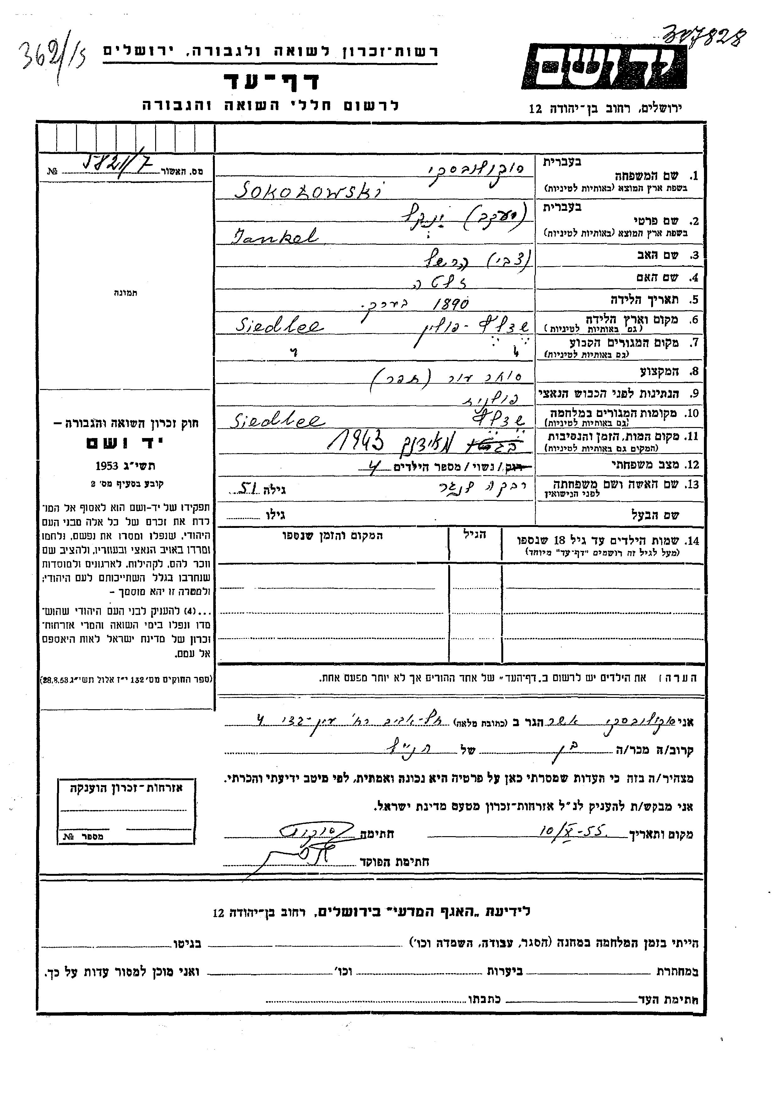 Yankel Sokolowski wurde im Jahr 1890 in Siedlce, Polen geboren. Er war der Sohn von Hershel Tzvi und Zlata. Er war Lederhändler/-in und mit Rivka, geb. Langer Verheiratet. Vor dem Zweiten Weltkrieg lebte er in Siedlce, Polen. Während des Krieges war er in Siedlce, Polen.