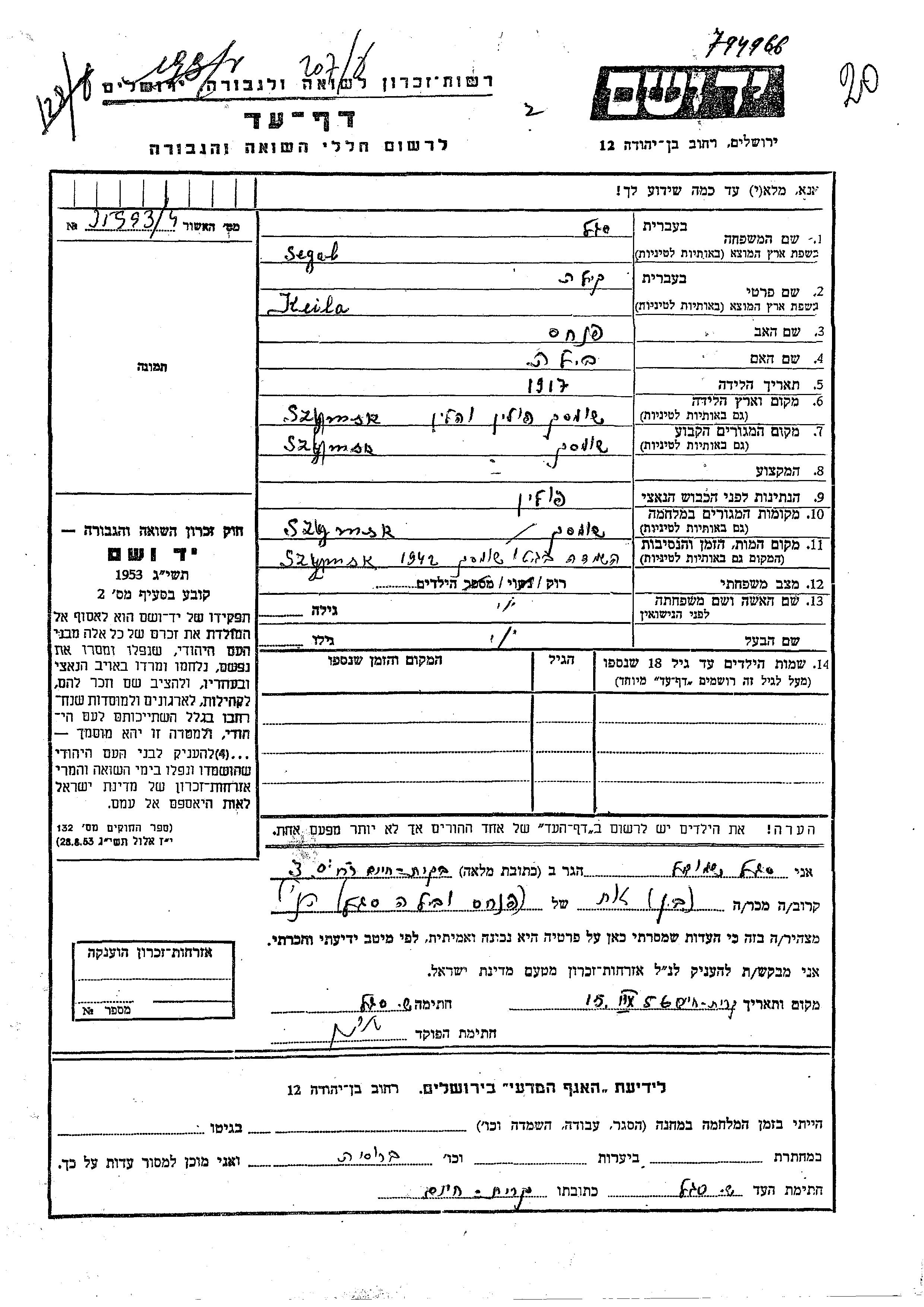 Keila Segal wurde im Jahr 1917 in Szumsk, Polen geboren. Sie war die Tochter von Pinkhas und Bila. Sie war Ledig. Vor dem Zweiten Weltkrieg lebte sie in Szumsk, Polen. Während des Krieges war sie in Szumsk, Polen.