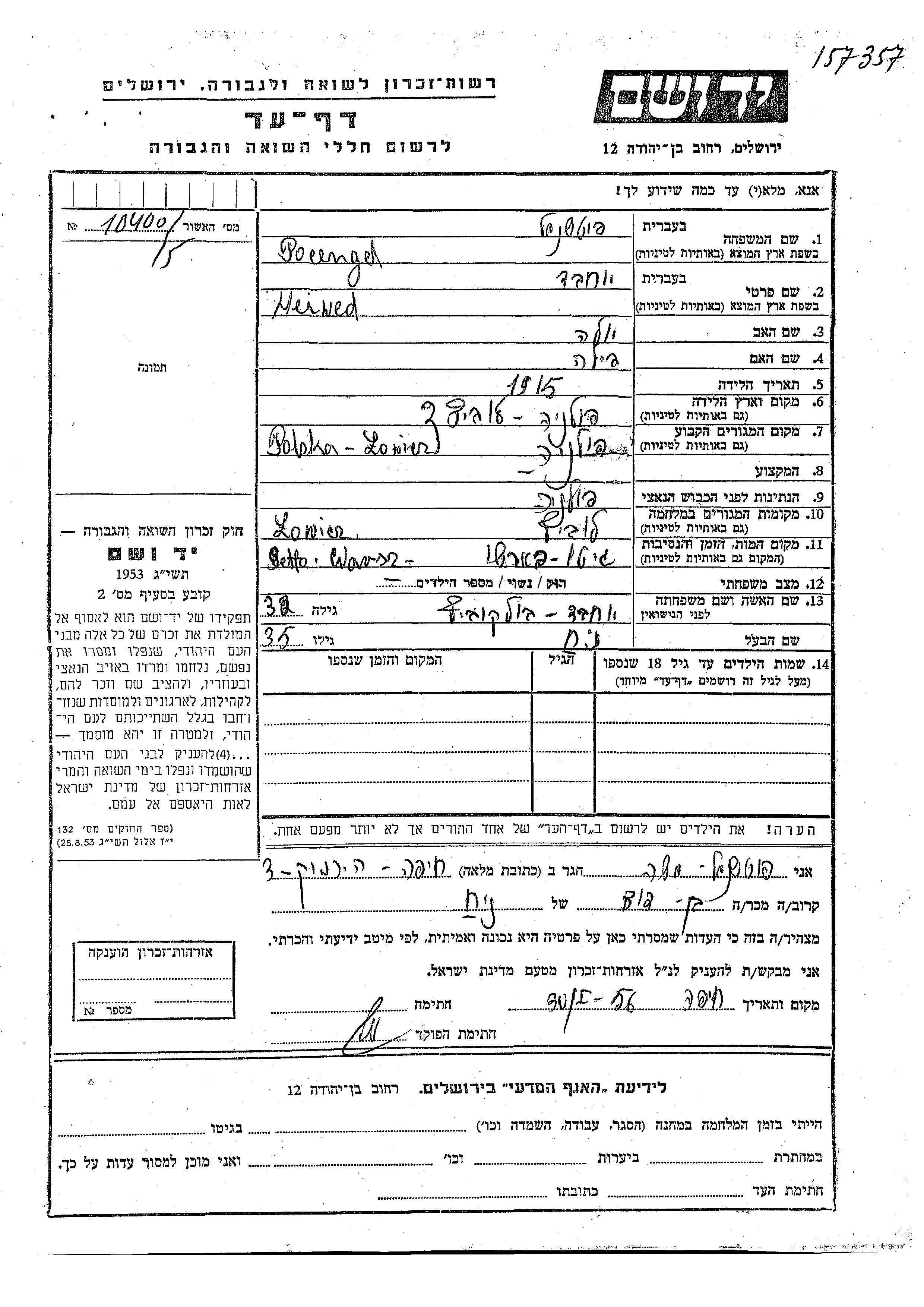 Heiwed Chana Pocengel, geb. Bulkovich wurde im Jahr 1915 in Lowicz, Polen geboren. Sie war die Tochter von Iula und Fila. Sie war mit Noakh Verheiratet. Vor dem Zweiten Weltkrieg lebte sie in Lowicz, Polen. Während des Krieges war sie in Lowicz, Polen.