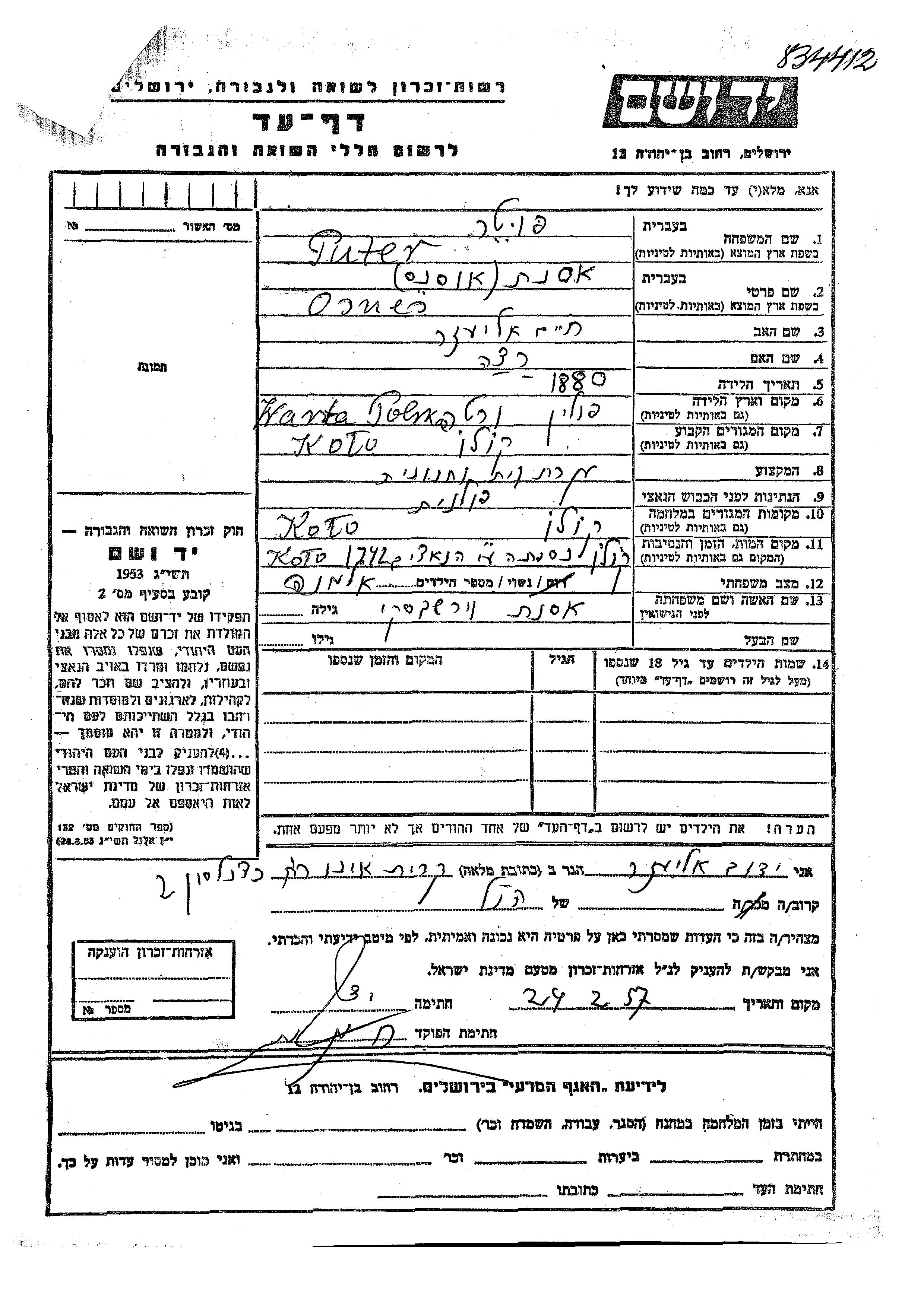 Osnes Puter Futer, geb. Varshavski wurde im Jahr 1880 in Warta, Polen geboren. Sie war die Tochter von Khaim Eliezer und Ratza. Sie war Lebensmittelhändler/-in und Witwe. Vor dem Zweiten Weltkrieg lebte sie in Kolo, Polen. Während des Krieges war sie in Kolo, Polen.