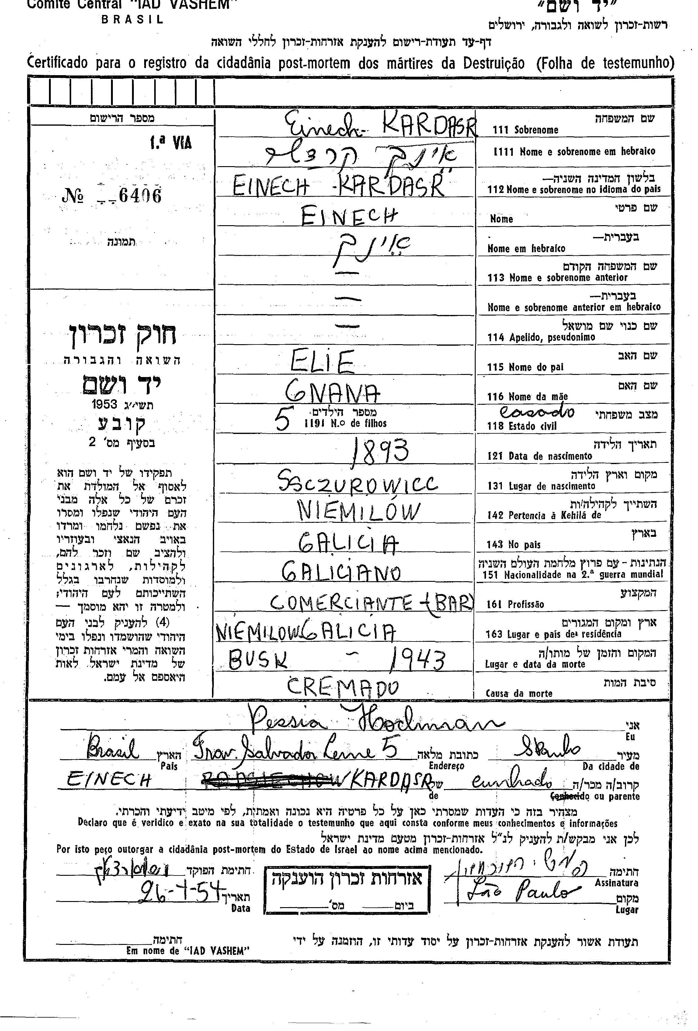 Einech Kardasr wurde im Jahr 1893 in Szczurowice, Polen geboren. Er war der Sohn von Elie und Gnana. Er war Kaufmann/-frau und Verheiratet. Vor dem Zweiten Weltkrieg lebte er in Galizien Region, Polen. Während des Krieges war er in Galizien Region, Polen.