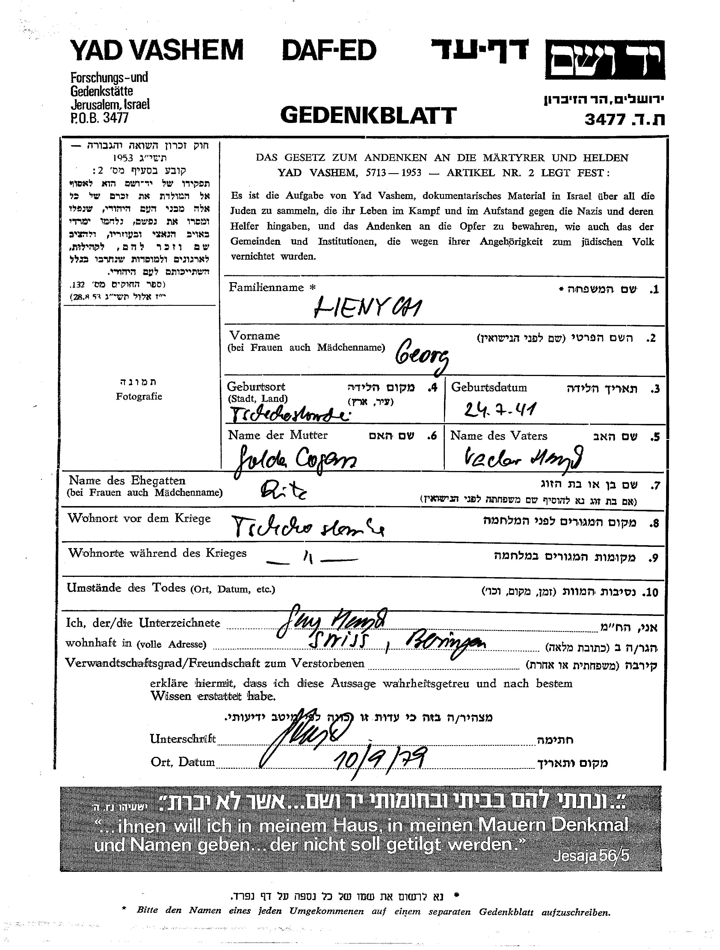 Georg Henych wurde im Jahr 1941 in Tschechoslowakei geboren. Er war der Sohn von Iakob und Golda. Er war Kind. Vor dem Zweiten Weltkrieg lebte er in Tschechoslowakei. Während des Krieges war er in Tschechoslowakei.