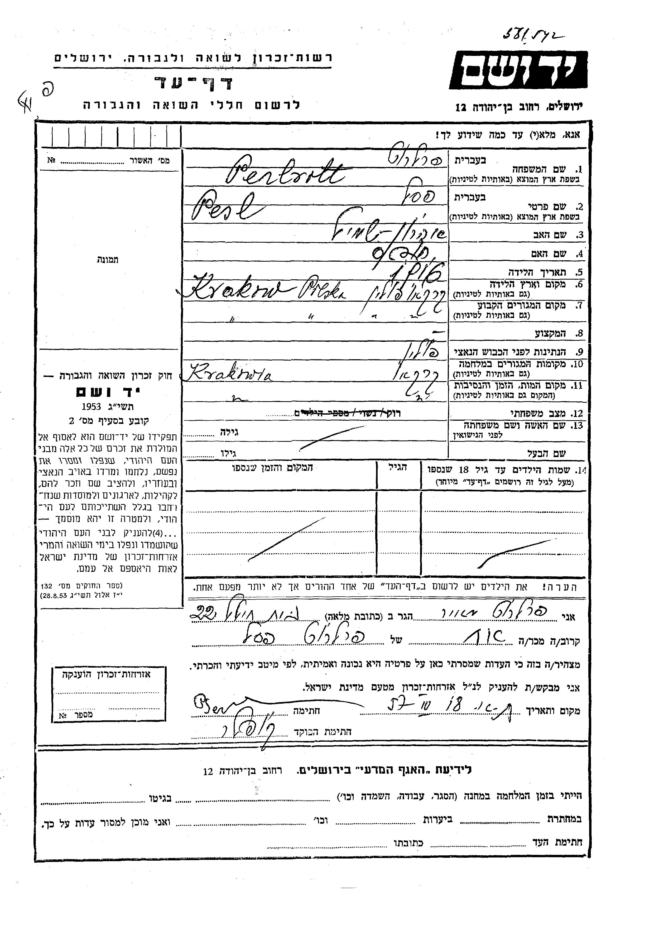 Pesl Pesel Perlrott wurde im Jahr 1916 in Krakow, Polen geboren. Sie war die Tochter von Aharon Shmil und Khudes. Sie war Ledig. Vor dem Zweiten Weltkrieg lebte sie in Krakow, Polen. Während des Krieges war sie in Krakow, Polen.