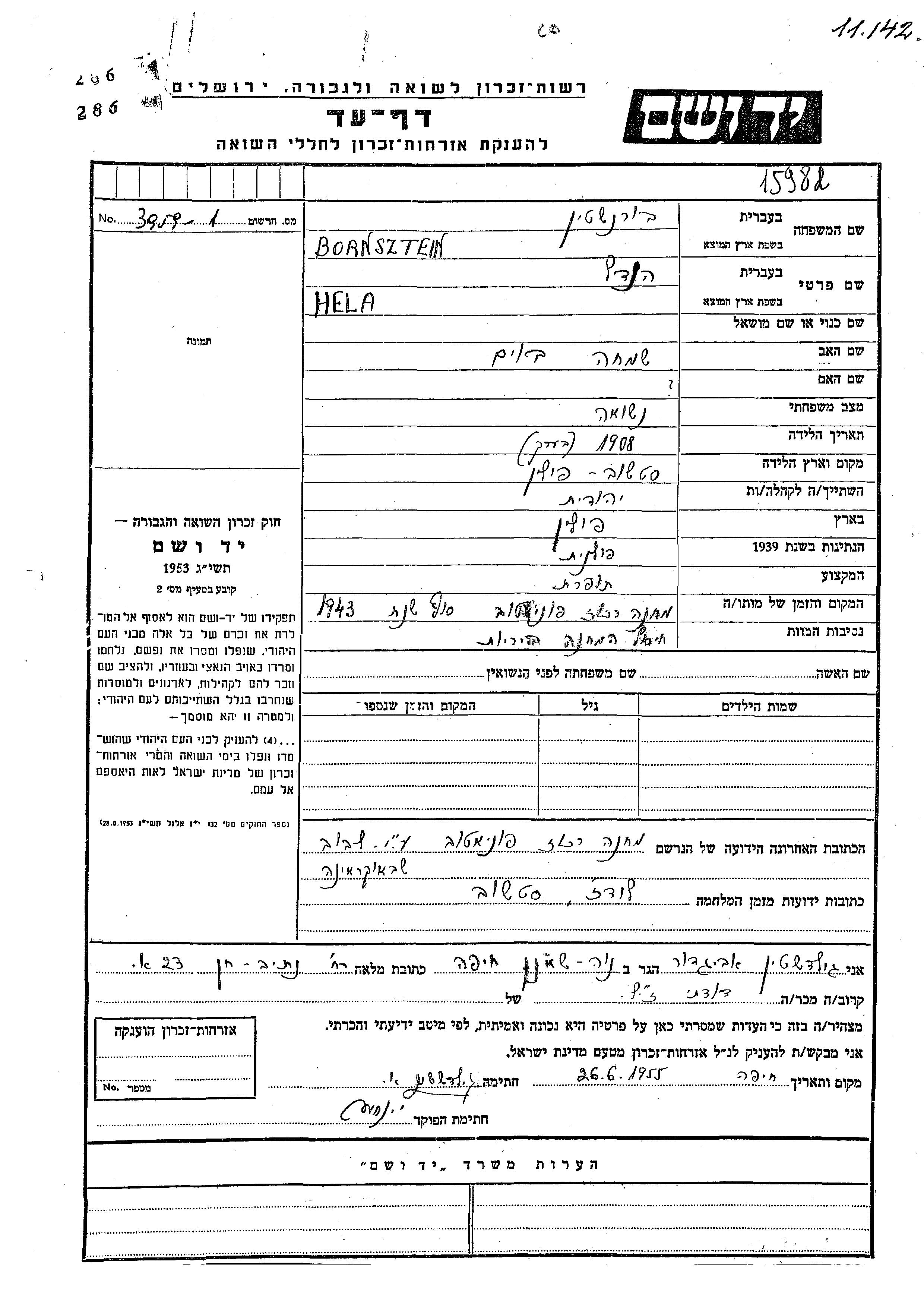 Hela Hendel wurde in der Schoah ermordet. Todesort: Poniatow, Polen im Jahr 1943.
