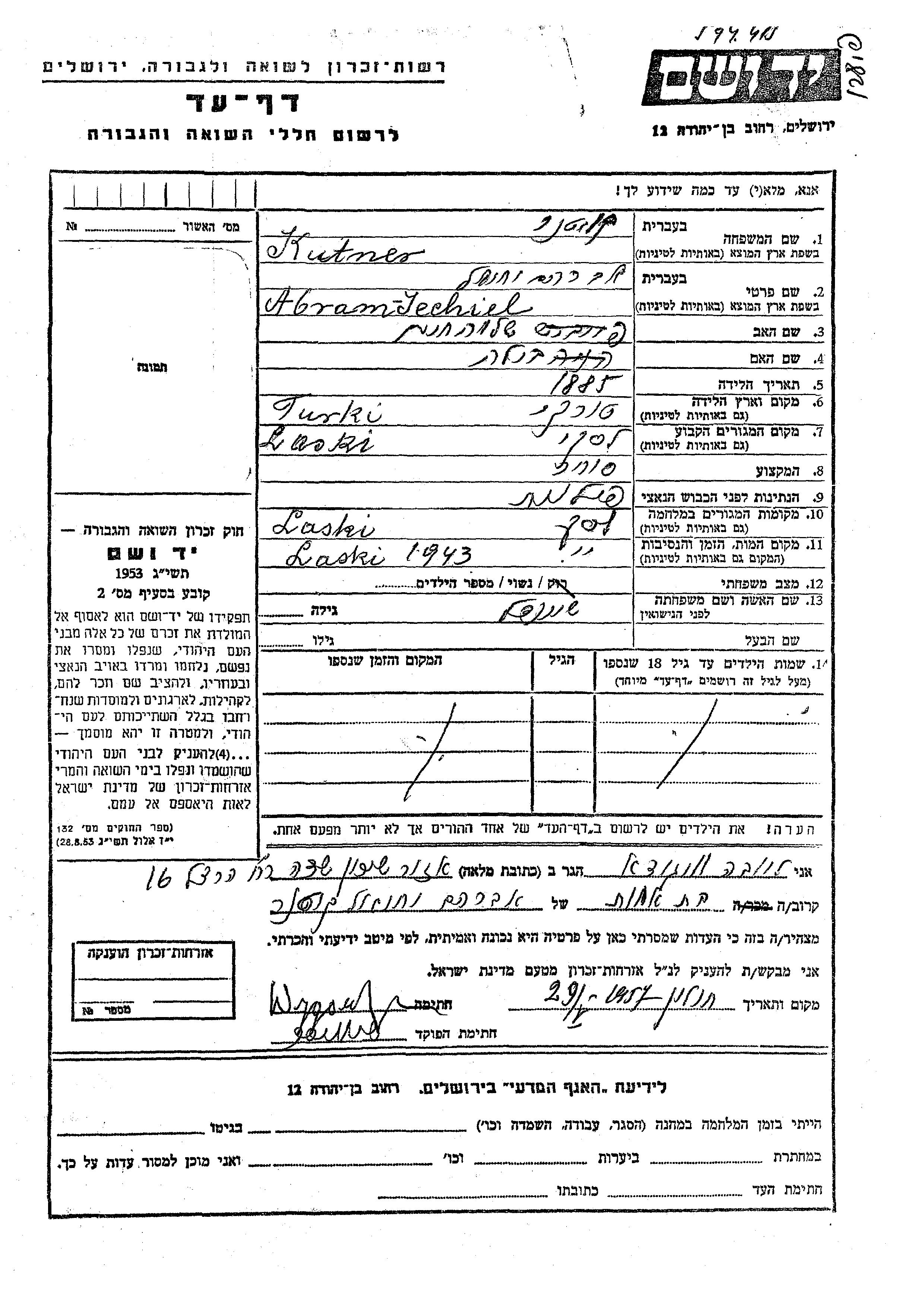 Abram Jechiel wurde in der Schoah ermordet. Todesort: Laski, Polen im Jahr 1943.