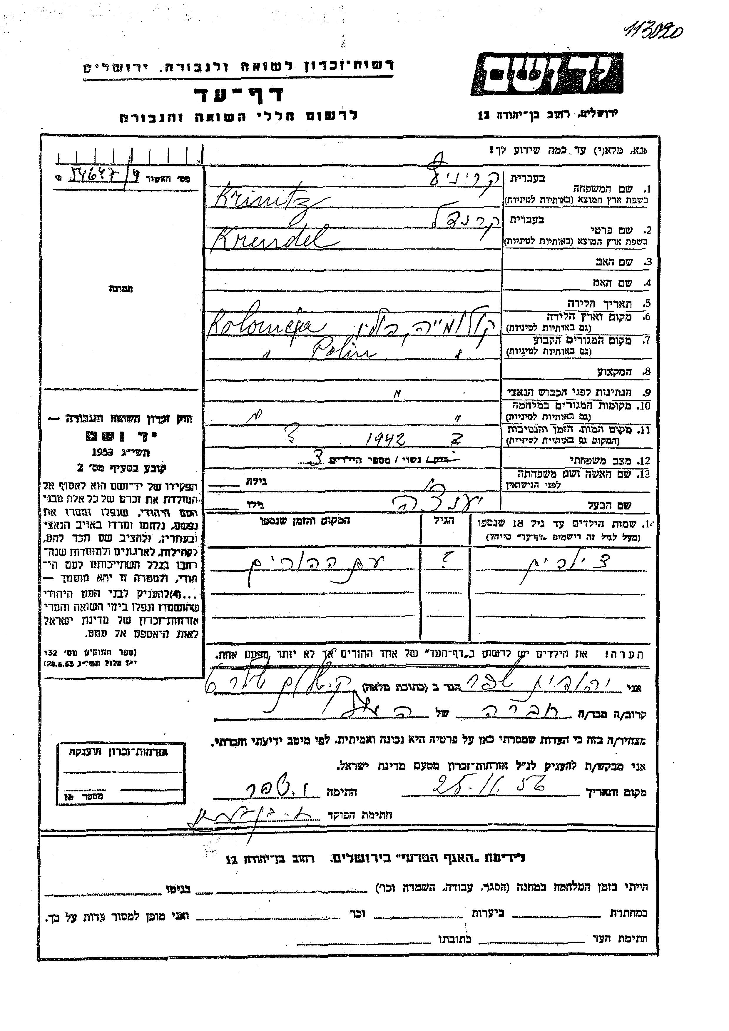 Kreina Krinitz wurde in Kolomyja, Polen geboren. Sie war mit Yanche Verheiratet. Vor dem Zweiten Weltkrieg lebte sie in Kolomyja, Polen. Während des Krieges war sie in Kolomyja, Polen.