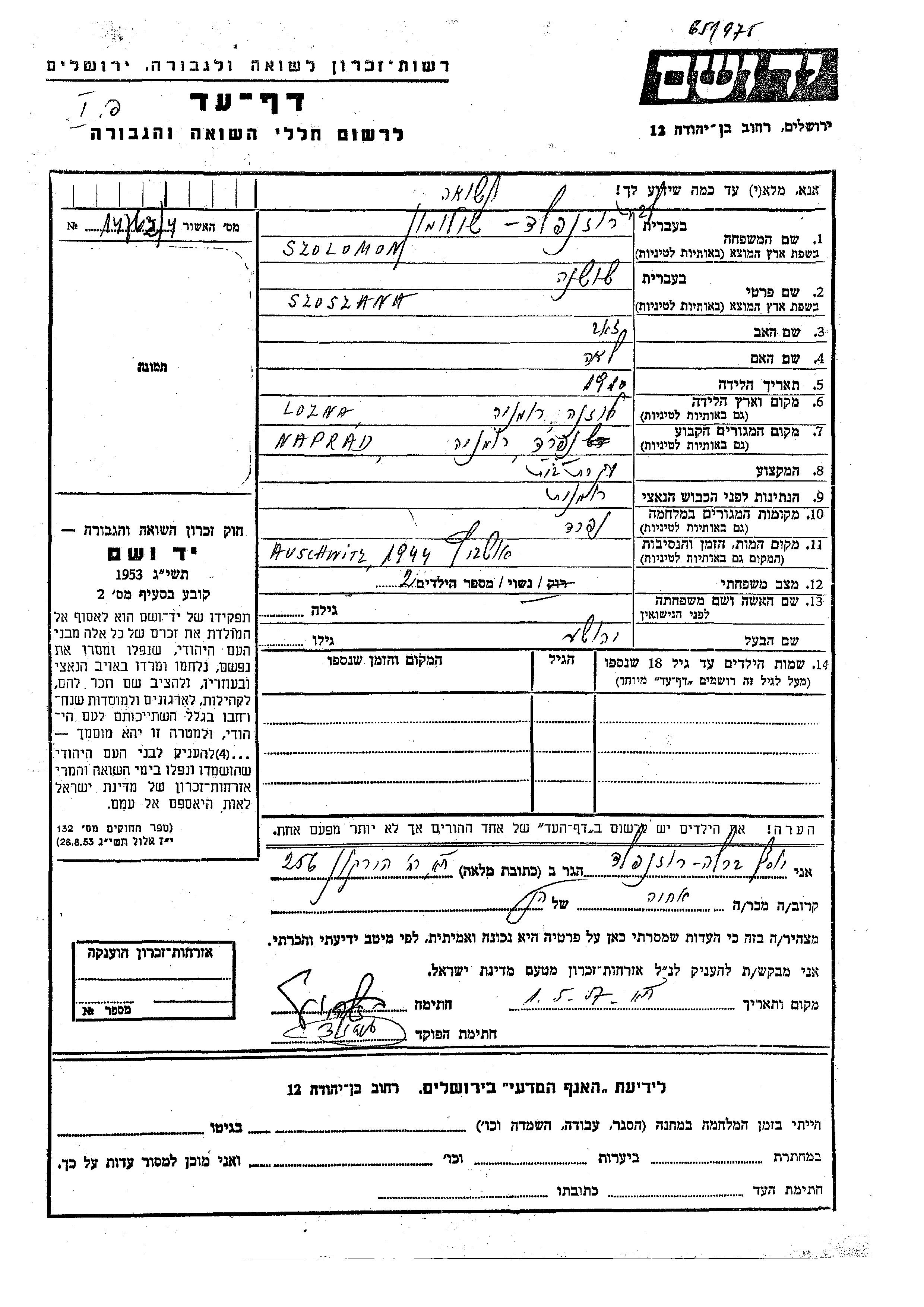 Szoszana Szolomon, geb. Rozenfeld wurde im Jahr 1910 in Lozna, Rumänien geboren. Sie war die Tochter von Zeev und Lea. Sie war Hausfrau und mit Yehoshua Verheiratet. Vor dem Zweiten Weltkrieg lebte sie in Naprad, Rumänien. Während des Krieges war sie in Naprad, Rumänien.