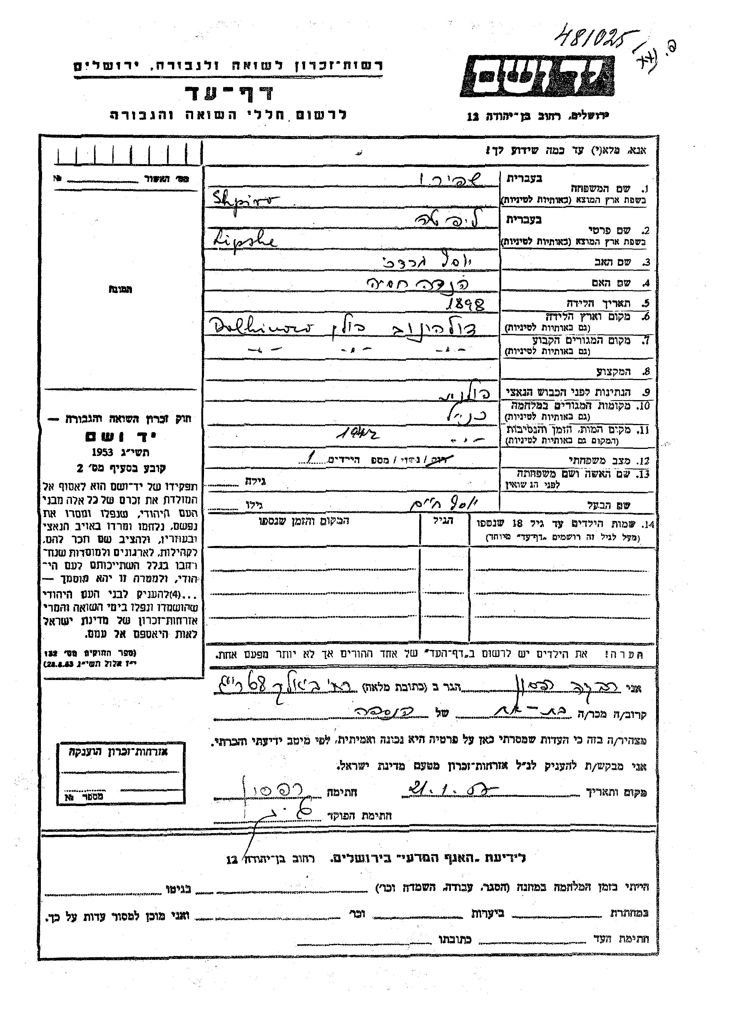 Lipshe Shpiro wurde im Jahr 1898 in Dolhinow, Polen geboren. Sie war die Tochter von Yosef Mordekhai und Hinda Khasia. Sie war mit Yosef Khaim Verheiratet. Vor dem Zweiten Weltkrieg lebte sie in Dolhinow, Polen. Während des Krieges war sie in Dolhinow, Polen.