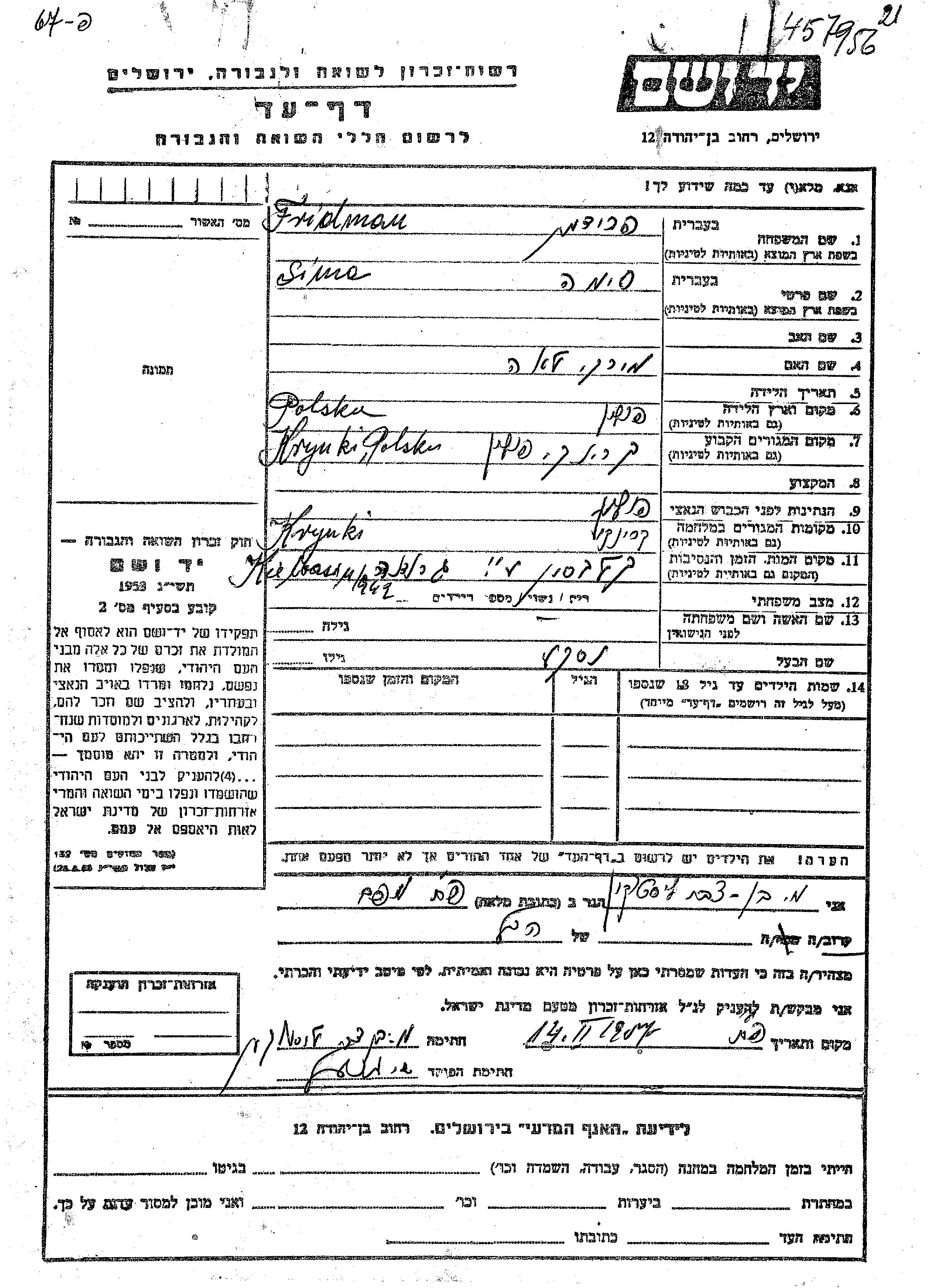 Sima wurde in der Schoah ermordet. Todesort: Kielbasin, Polen im Jahr 1942.