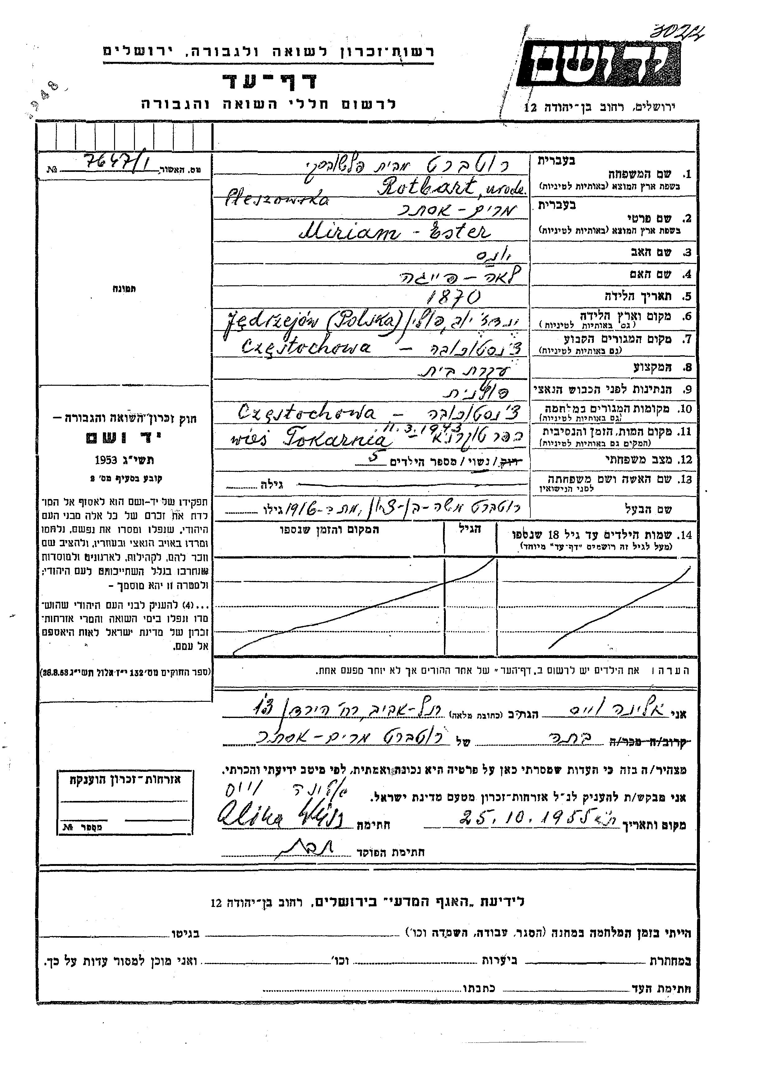 Miriam Ester Rotbart, geb. Pleszowska wurde im Jahr 1870 in Jedrzejow, Polen geboren. Sie war die Tochter von Ionas und Lea Feiga. Sie war Hausfrau und mit Moshe Bentzion Verheiratet. Vor dem Zweiten Weltkrieg lebte sie in Czestochowa, Polen. Während des Krieges war sie in Czestochowa, Polen.
