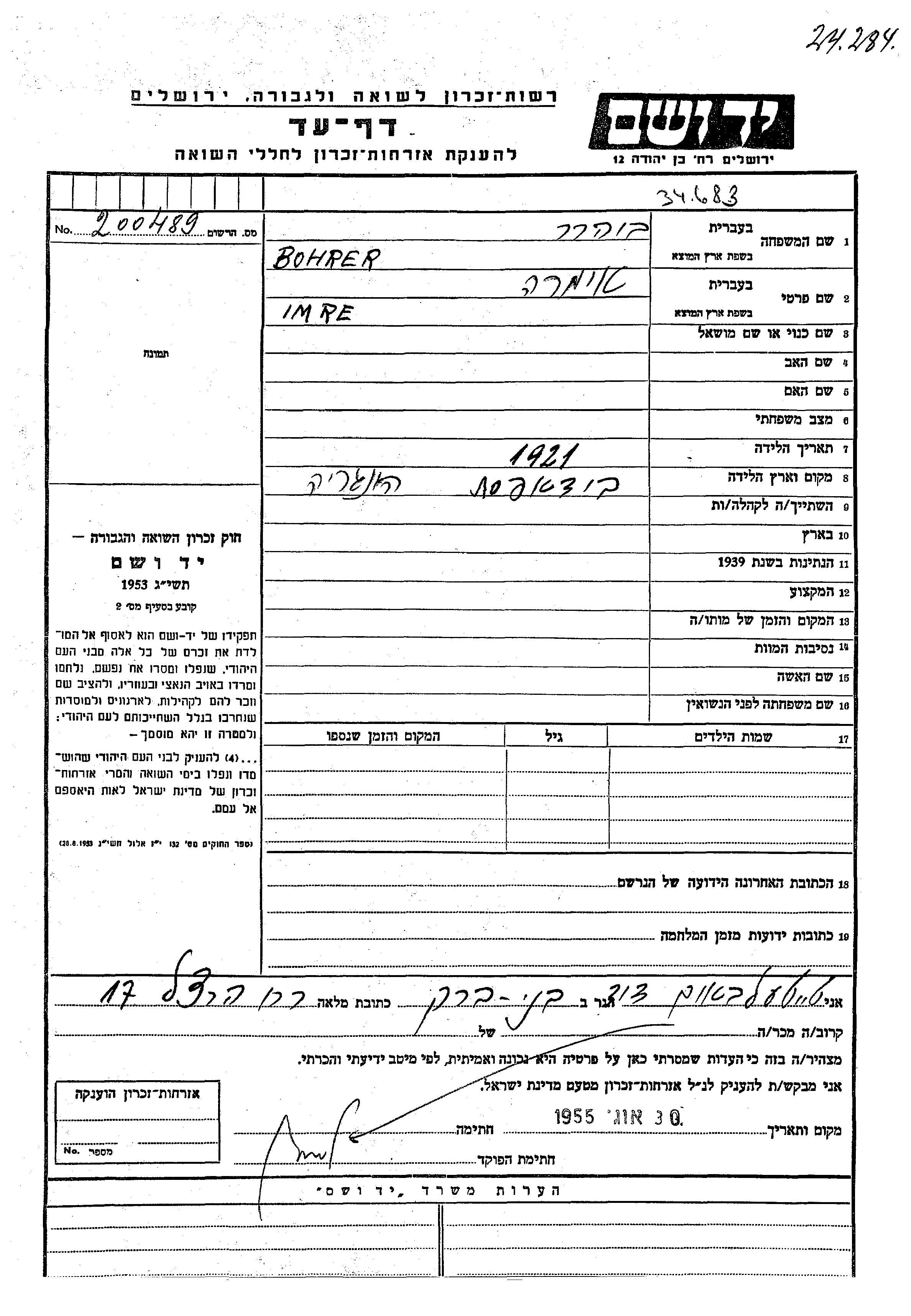Bohrer Imre 1921 unbekannter Ort, Gedenkblatt