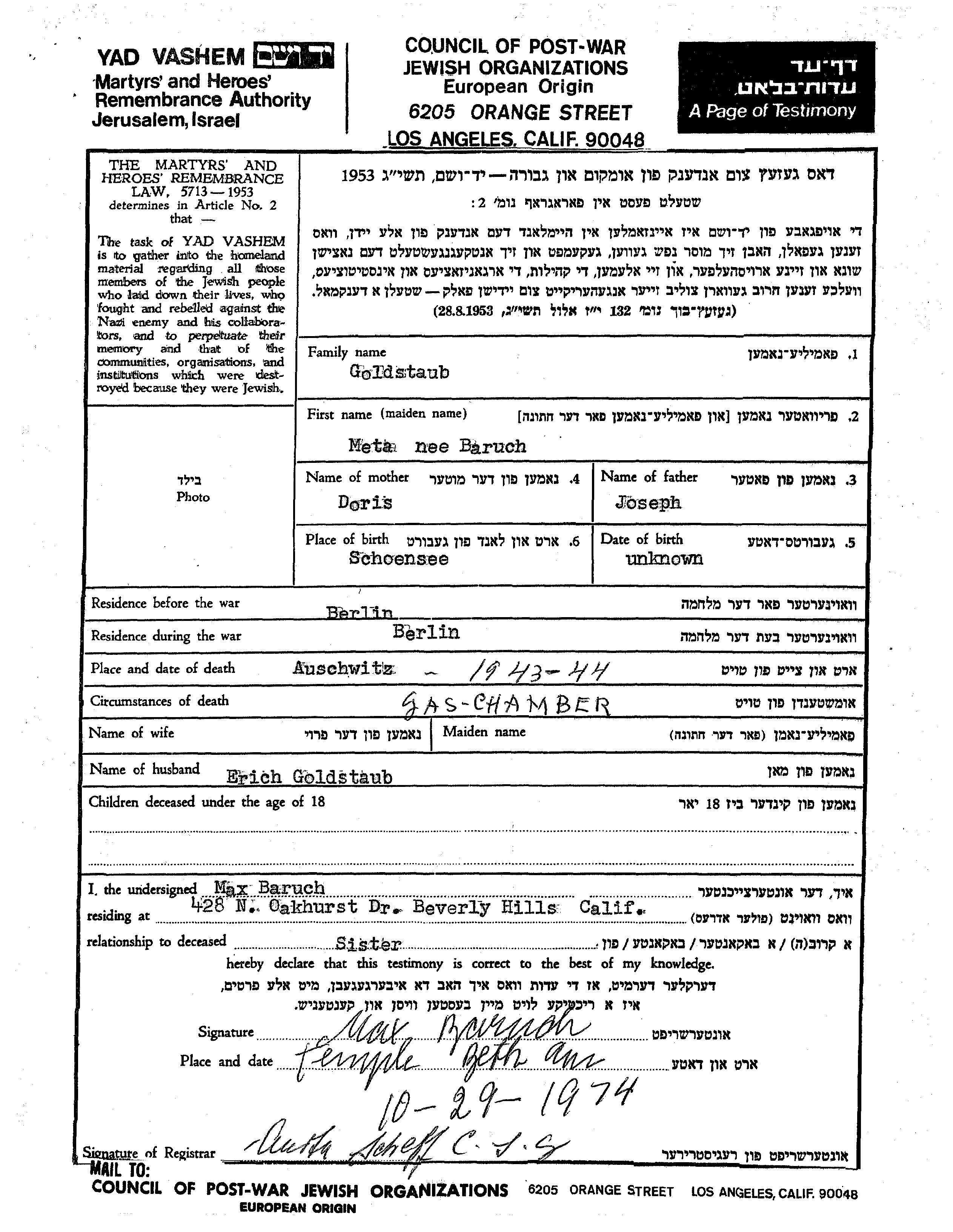 Meta Goldstaub, geb. Baruch wurde in Schoensee, Deutsches Reich geboren. Sie war die Tochter von Joseph und Doris. Sie war mit Erich Verheiratet. Vor dem Zweiten Weltkrieg lebte sie in Berlin, Deutsches Reich. Während des Krieges war sie in Berlin, Deutsches Reich.