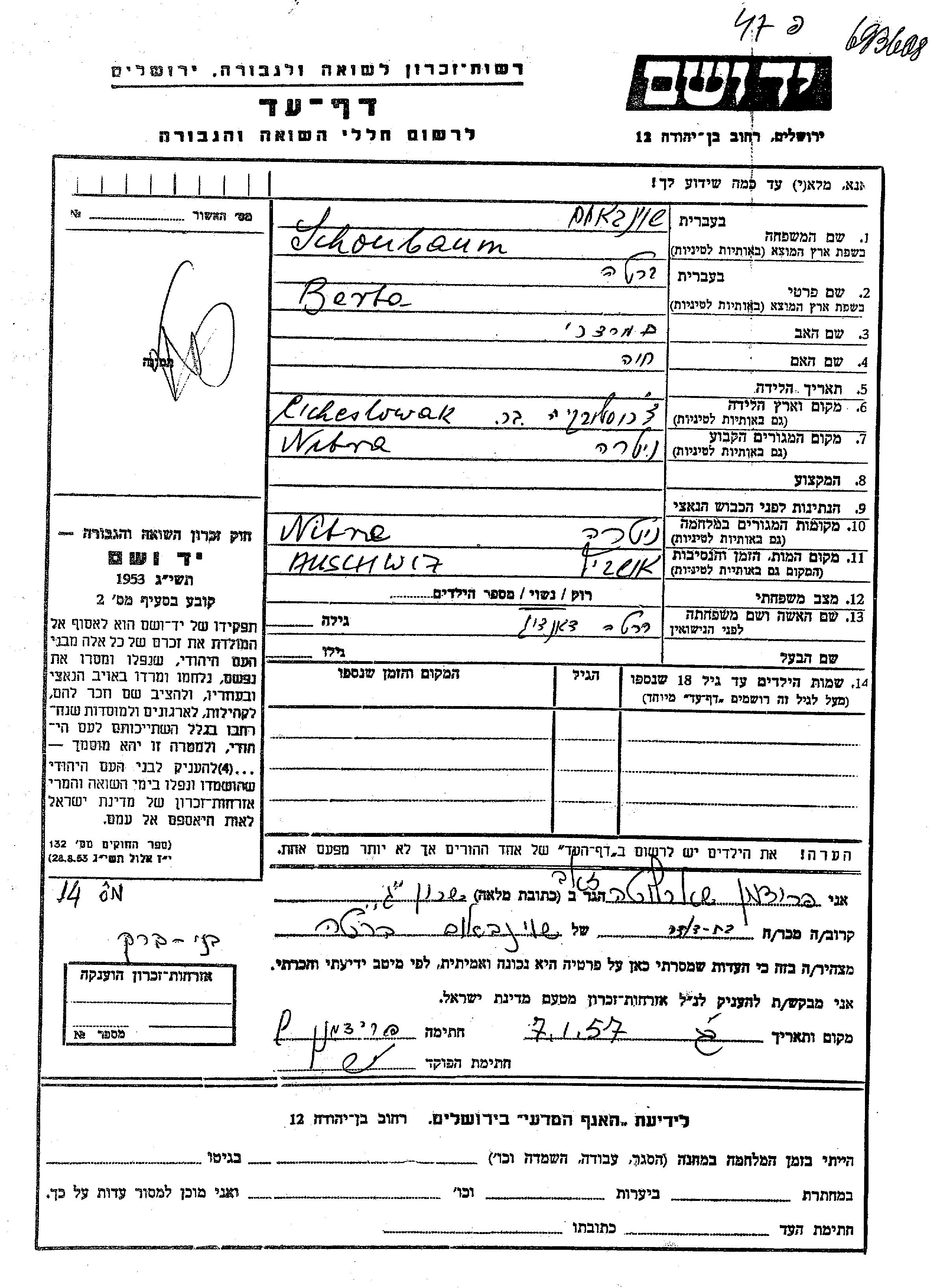 Berta Schonbaum, geb. Dantzig wurde in Tschechoslowakei geboren. Sie war die Tochter von Mordekhai und Khaia. Sie war Verheiratet. Vor dem Zweiten Weltkrieg lebte sie in Nitra, Tschechoslowakei. Während des Krieges war sie in Nitra, Tschechoslowakei.