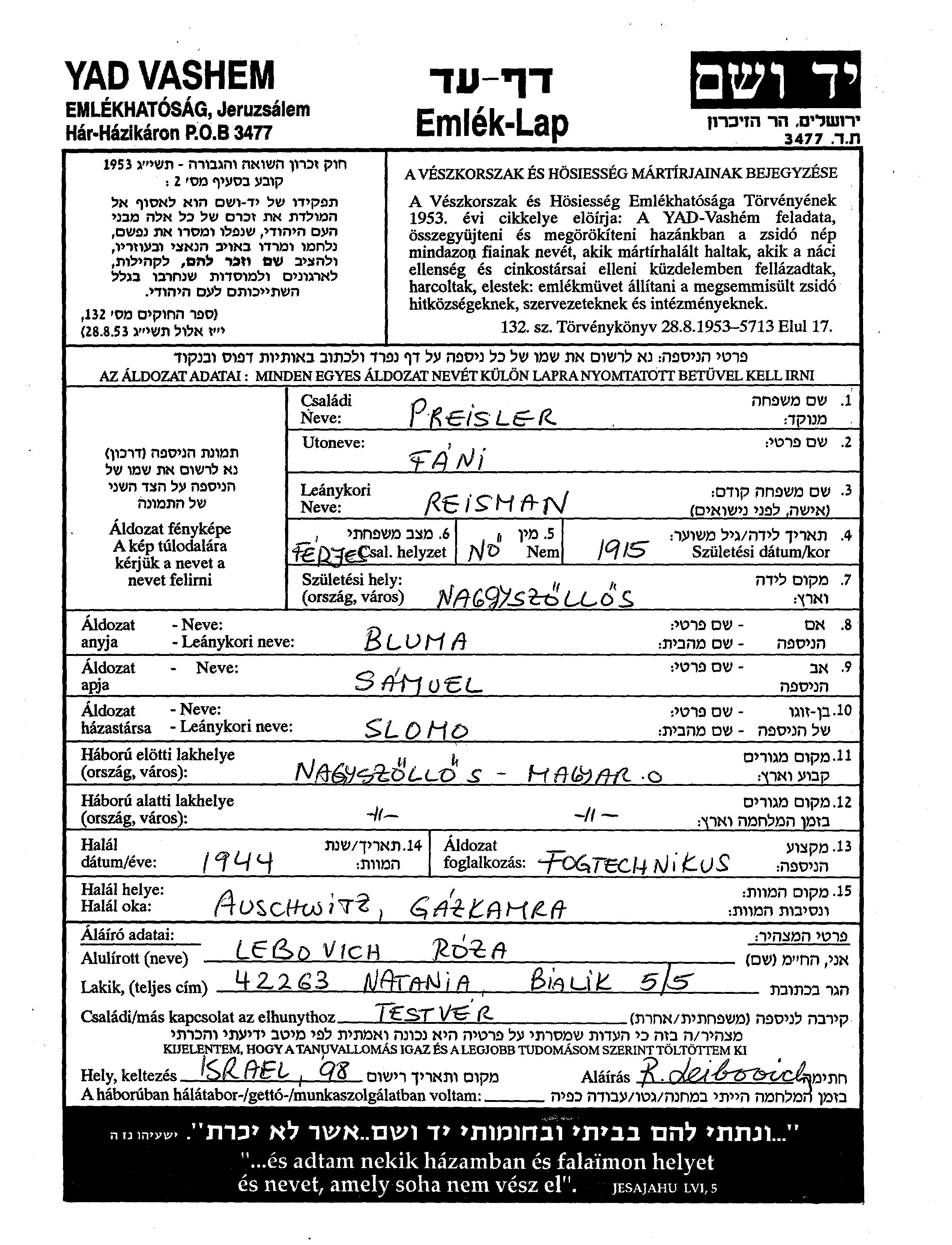 Fani Preisler, geb. Reisman wurde im Jahr 1915 in Nagyszollos, Tschechoslowakei geboren. Sie war die Tochter von Samuel und Bluma. Sie war Zahntechniker/-in und mit Slomo Verheiratet. Vor dem Zweiten Weltkrieg lebte sie in Nagyszollos, Tschechoslowakei. Während des Krieges war sie in Nagyszollos, Tschechoslowakei.