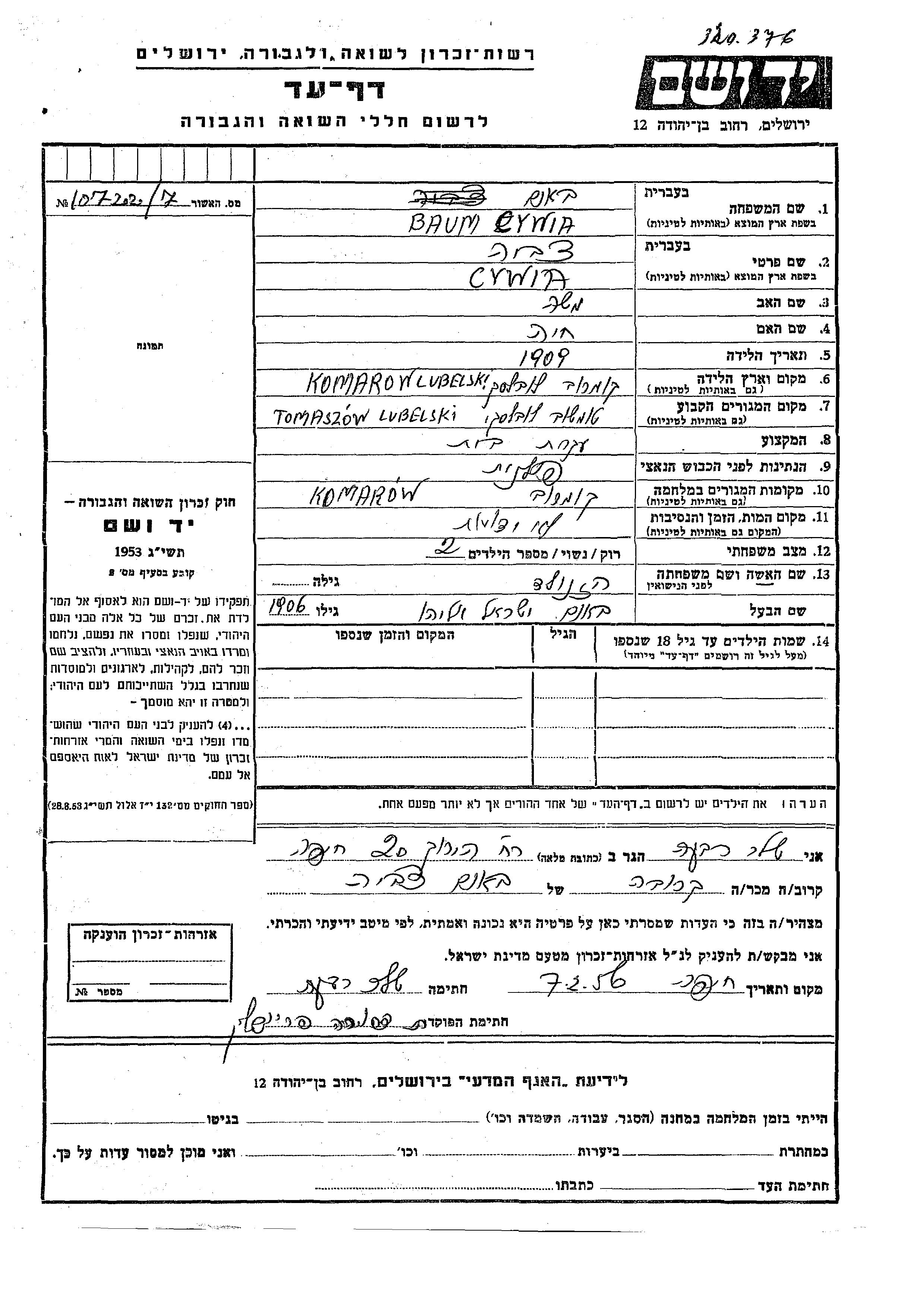 Cywia Baum, geb. Khazenvald wurde im Jahr 1909 in Komarow, Polen geboren. Sie war die Tochter von Moshe und Khaia. Sie war Hausfrau und mit Yisrael Eliahu Verheiratet. Vor dem Zweiten Weltkrieg lebte sie in Tomaszow, Polen. Während des Krieges war sie in Komarow.