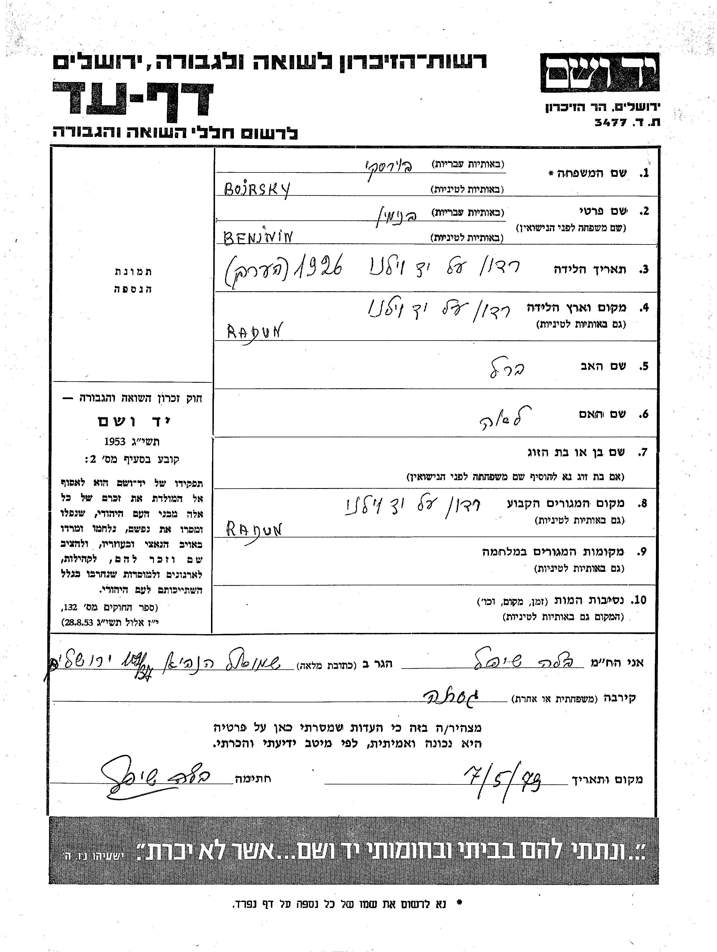 Benjmin Bojrsky wurde im Jahr 1926 in Radun, Polen geboren. Er war der Sohn von Berl und Lea. Vor dem Zweiten Weltkrieg lebte er in Radun, Polen.