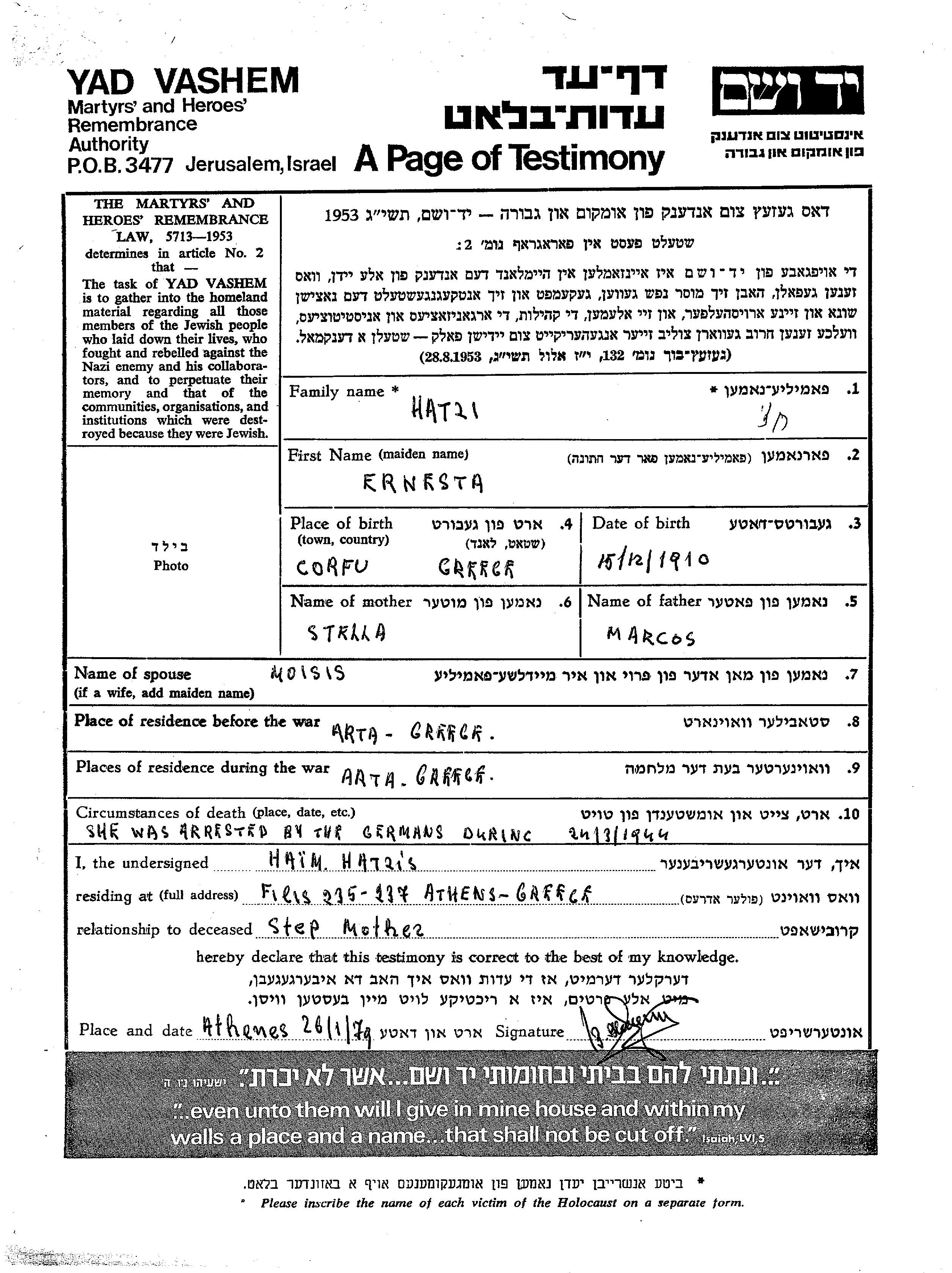 Ernesta Hatzi wurde im Jahr 1910 in Corfu, Griechenland geboren. Sie war die Tochter von Marcos und Stella. Sie war mit Moisis Verheiratet. Vor dem Zweiten Weltkrieg lebte sie in Arta, Griechenland. Während des Krieges war sie in Arta, Griechenland.