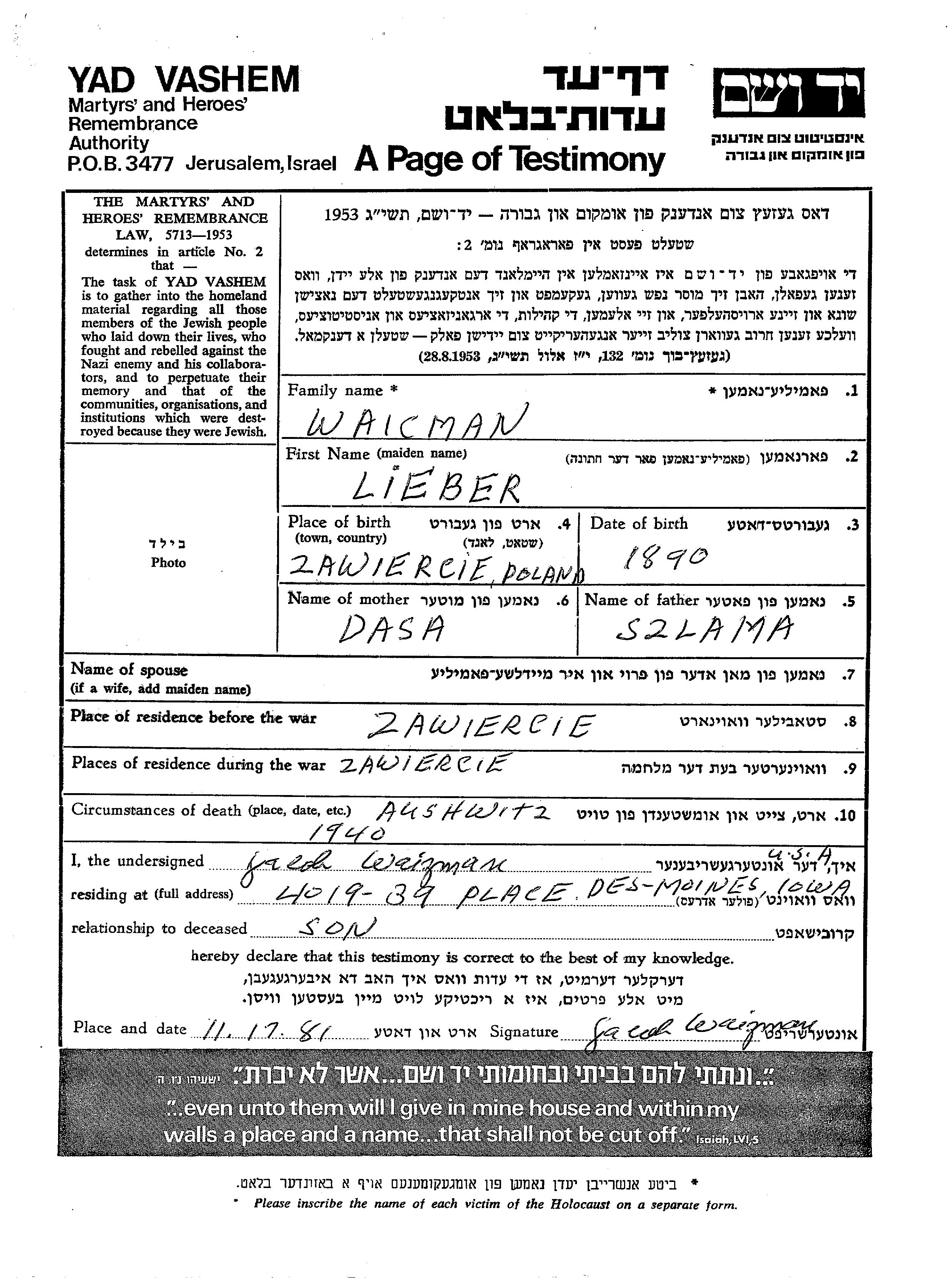 Lieber Waicman wurde im Jahr 1890 in Zawiercie, Polen geboren. Er war der Sohn von Szlama und Hadasa. Vor dem Zweiten Weltkrieg lebte er in Zawiercie, Polen. Während des Krieges war er in Zawiercie, Polen.