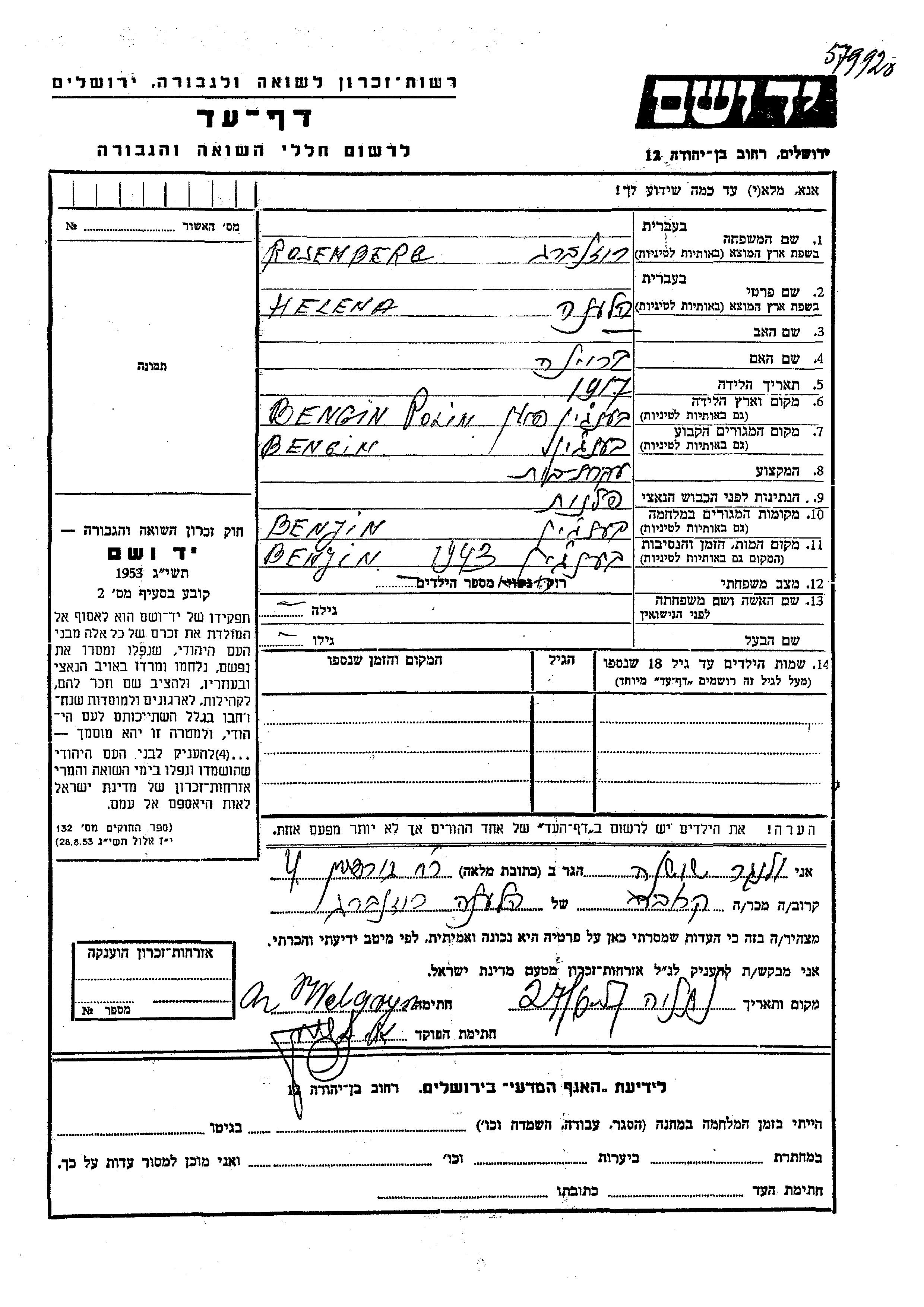 Helena Rosenberg wurde im Jahr 1917 in Bengin, Polen geboren. Sie war die Tochter von Breina. Sie war Hausfrau und Ledig. Vor dem Zweiten Weltkrieg lebte sie in Bengin, Polen. Während des Krieges war sie in Bengin, Polen.