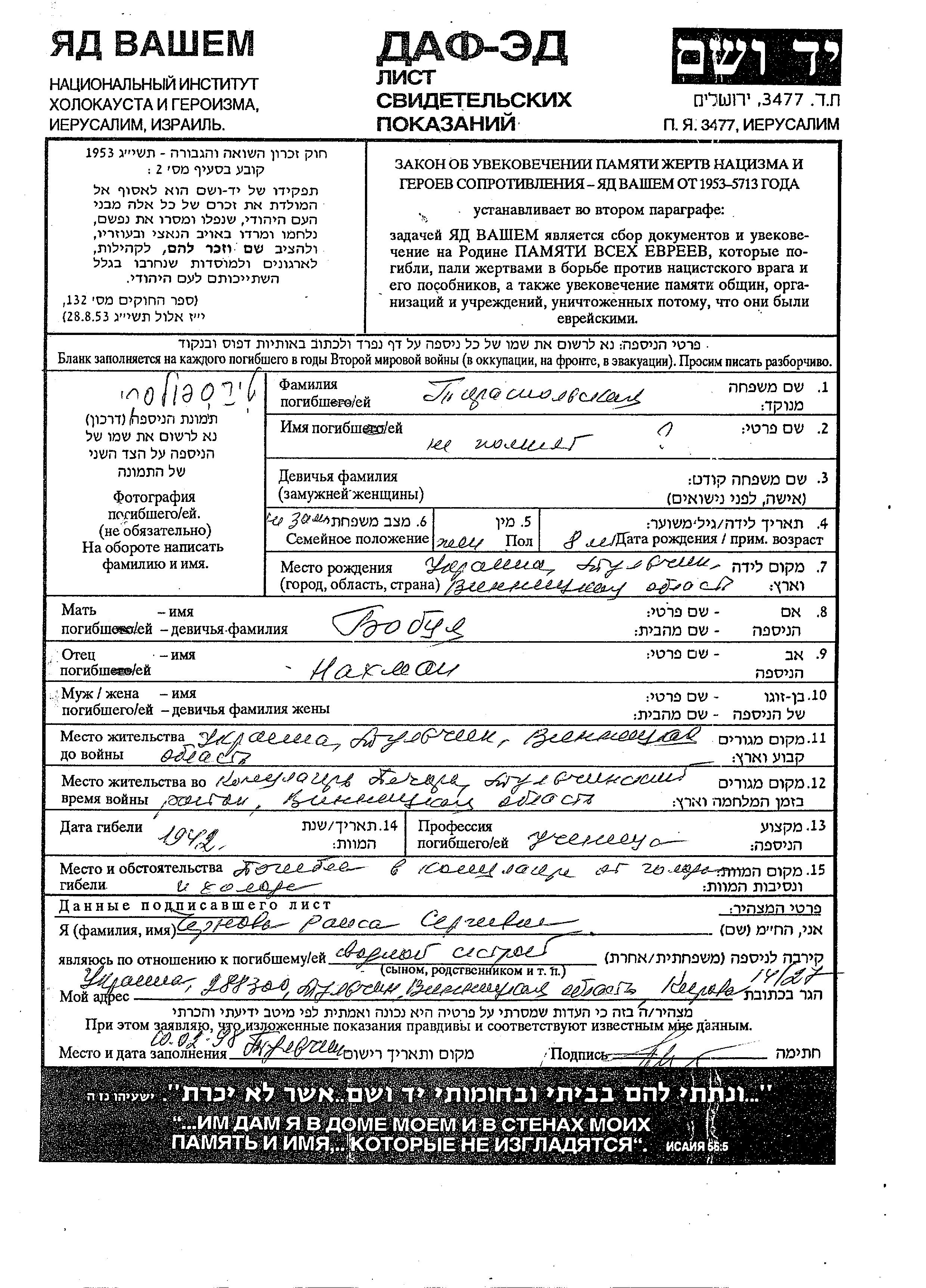 Vorname unbekannt Tiraspolski wurde in Tulchin, Ukraine (UdSSR) geboren. Sie war die Tochter von Nakhman und Bobtzya. Vor dem Zweiten Weltkrieg lebte sie in Tulchin, Ukraine (UdSSR). Während des Krieges war sie in Pechora, Ukraine (UdSSR).