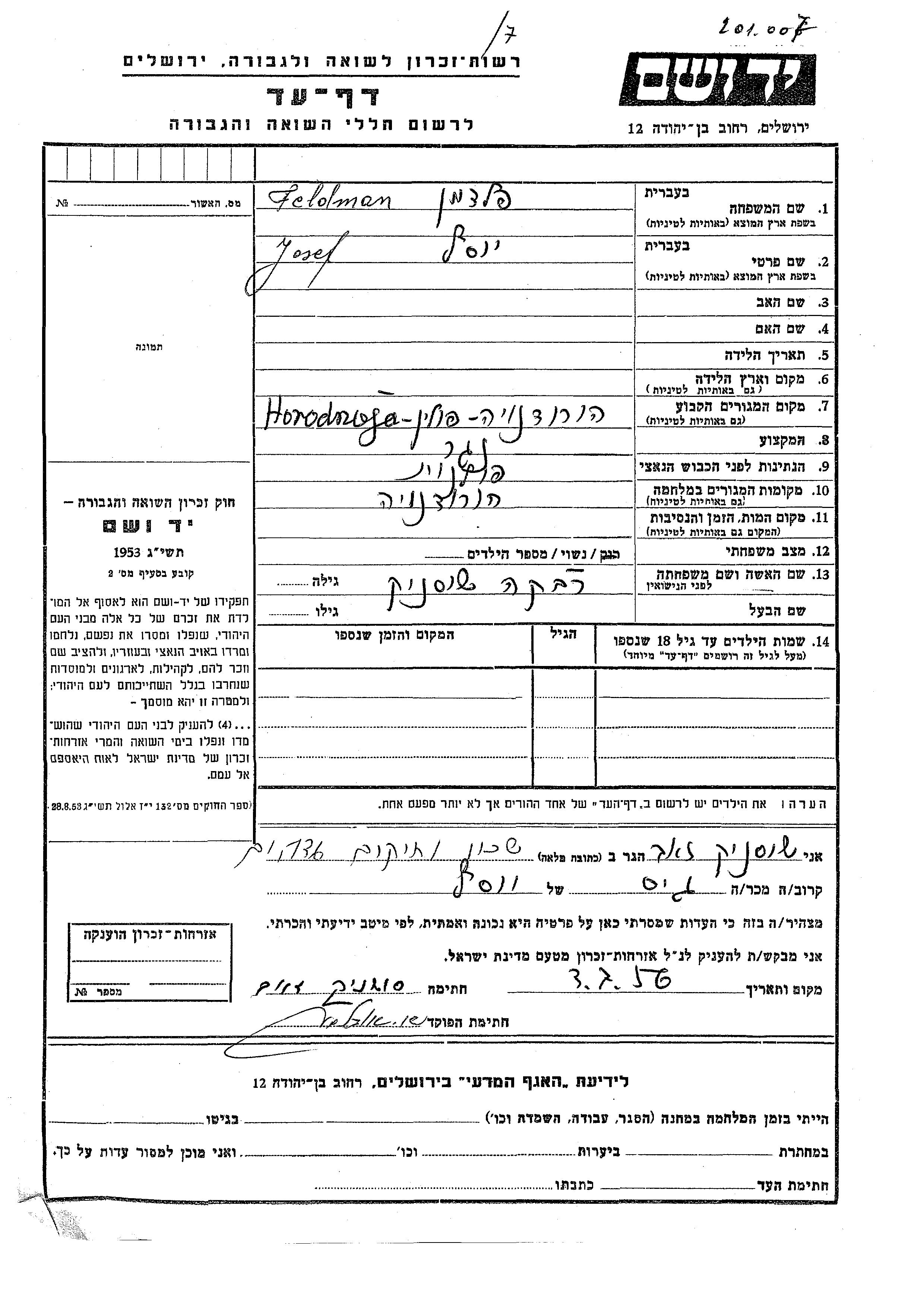 Yosef Feldman. Er war Zimmermann und mit Rivka, geb. Shosnik Verheiratet. Vor dem Zweiten Weltkrieg lebte er in Horodno, Polen. Während des Krieges war er in Horodno, Polen.