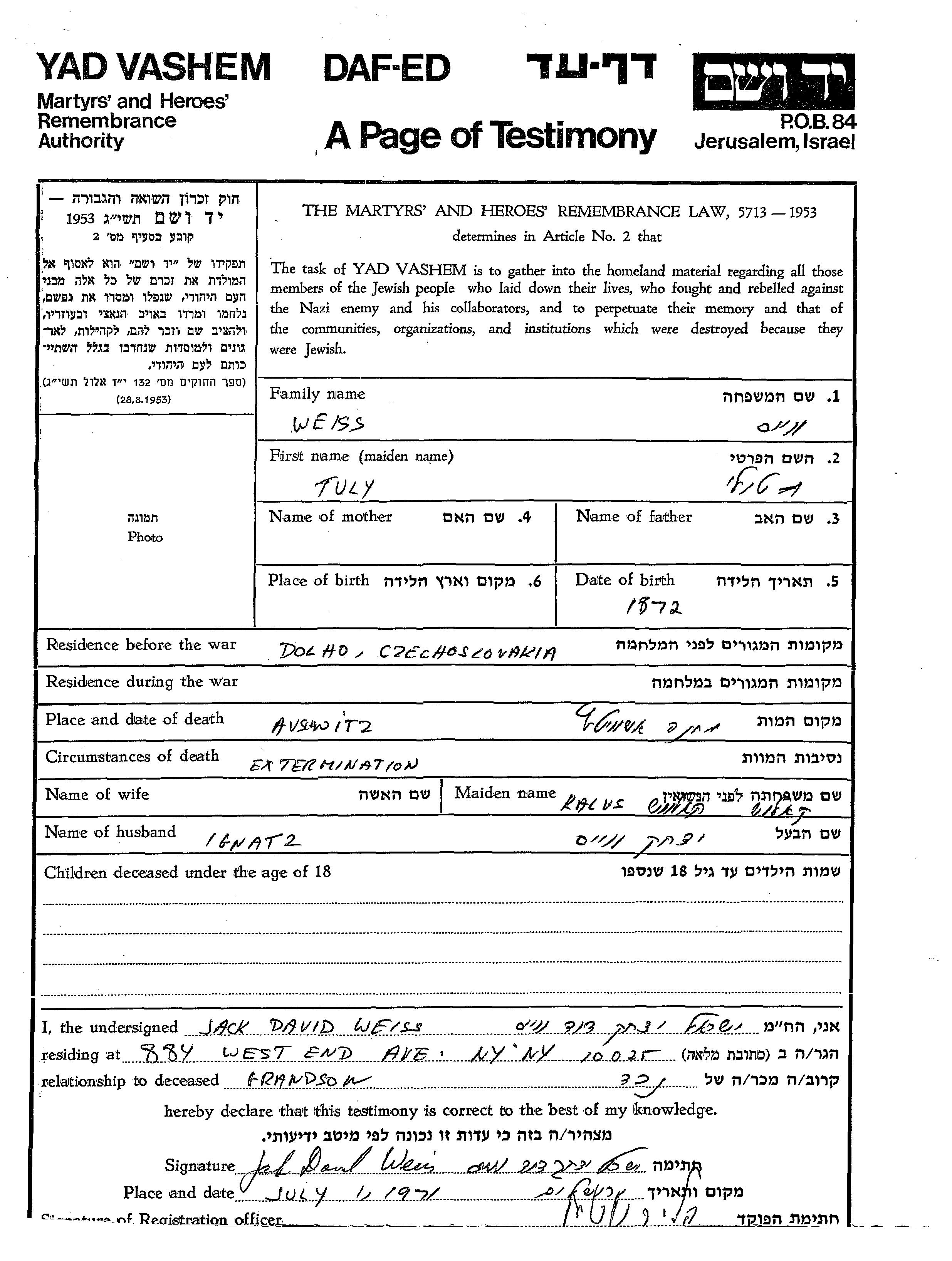 Tuly Weiss wurde im Jahr 1872 geboren. Er war mit Ignatz Yitzkhak Verheiratet. Vor dem Zweiten Weltkrieg lebte er in Dolhoje, Tschechoslowakei.